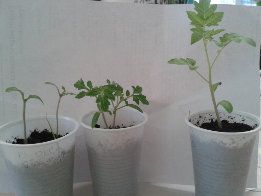 Высеяла одновременно 2 сорта "Балконное чудо" и "Клюква в сахаре". На фото справа: крайний правый - "Балконное чудо" (и такие все), 2 слева "Клюква в сахаре" на одном сроке роста. В стаканчике посередине 1 корень с 2-мя ростками (таких взошло 2). На снимке слева ростки "Клюква в сахаре": хиленькие, кривенькие, многие без точек роста. Для сравнения справа на снимке "Балконное чудо". Вот такая развесистая клюква.