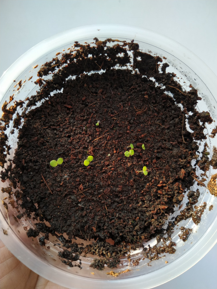 В пачке было 10 семян (размер меньше крупинок манной крупы). Грунт покупной, универсальный, перед посевом полилась его. Вытряхнула на поверхность семена из пачки, как упали, так упали. Сверху закрыла прозрачной крышкой. До сих пор стоят под крышкой, так как дома отопление, сухой воздух. Фото сделано сегодня 24.02.19. Первые 3 взошли дружно, остальные потихоньку следом. Из 10, вижу 7. Это мой первый опыт выращивания однолеток на рассаду.
