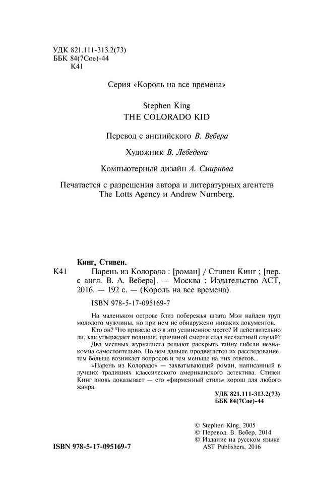 💳 Оплатить за товар можно при получении 🇰🇿 Есть бесплатная доставка по Казахстану от 1 дня 🎁 Копите бонусы с каждой покупки Серия: Король на все времена На маленьком острове близ побережья штата Мэн найден труп молодого мужчины, но при нем не обнаружено никаких документов. |