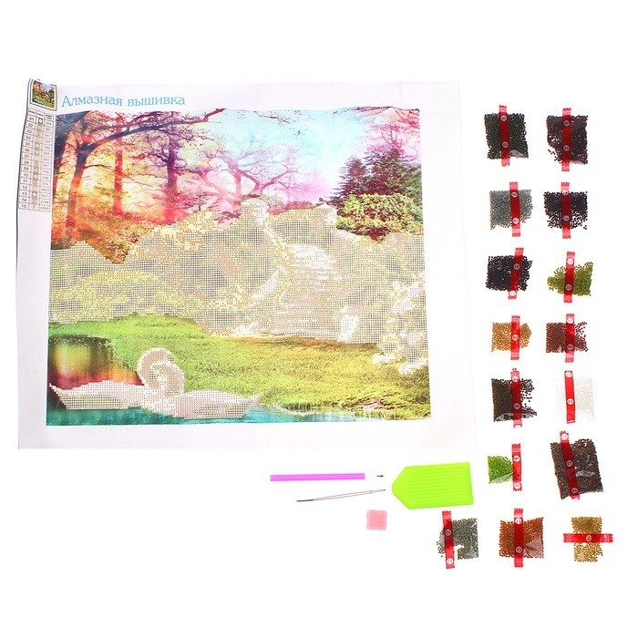 Описание в целом соответствует действительности. Удобное компактное оформление. Единственное, в наборе нет пинцета, зато есть клеевая подушечка для карандаша. Немного удивило, что картина в формате книжного листа, а не альбомного (т.е. 37 - это ширина картины). Приложенная на сайте схема тоже немного не соответствует реальности: "вышивать" придется не только лебедей и лестницу, а полностью всю нижнюю часть картины. Нарисованными останутся деревья. В целом покупка порадовала. Спасибо команде Flip-а))