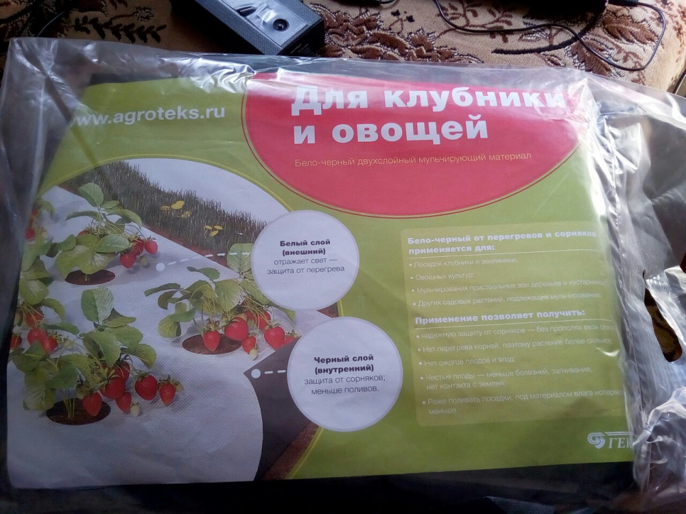 Посылка пришла очень быстро, качество хорошее, но белая сторона не такая уж и белая , буду сажать клубнику через 2 дня, отверстий нет, можно посадить по желанию и почаще. Ткань прочная, рекомендую.
