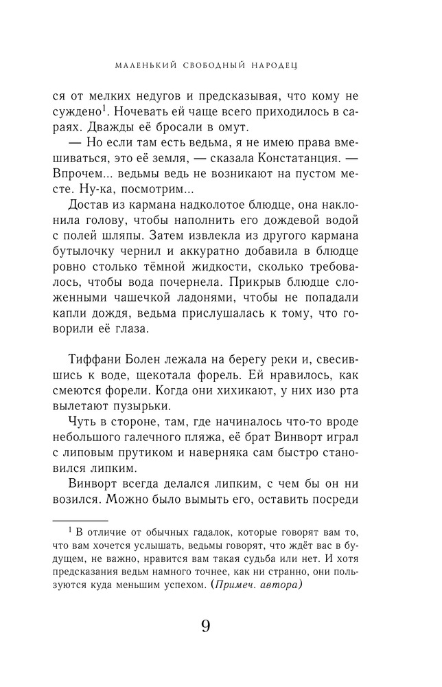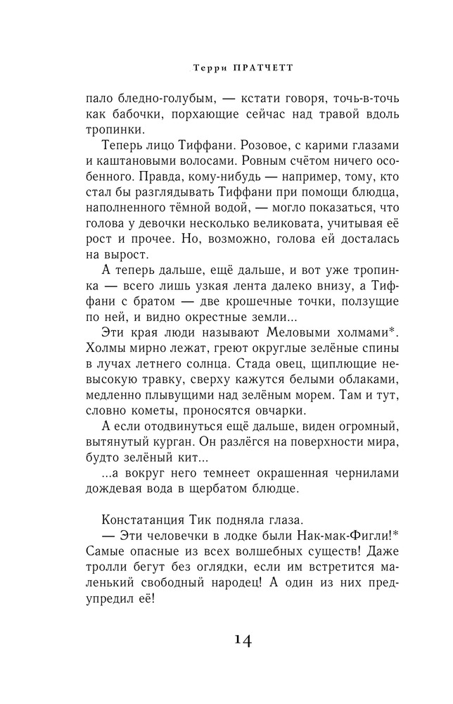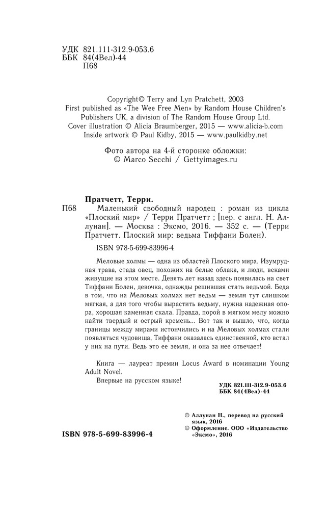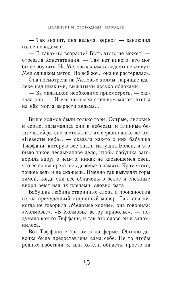 Маленький свободный народецВ данный момент этот товар отсутствует в продаже. Возможно, у нас найдется аналогичный или похожий товар здесь. Серия: Терри Пратчетт. Плоский мир: ведьма Тиффани Болен Меловые холмы — одна из областей Плоского мира. Изумрудная трава, стада овец, похожих на белые облака, и люди, веками живущие на этом месте. Девять лет назад здесь появилась на свет Тиффани Болен, девочка, однажды решившая стать ведьмой. Беда в том, что на Меловых холмах нет ведьм — земля тут слишком мягкая, а для того, чтобы вырастить ведьму, нужна надёжная опора, хорошая каменная скала. Правда, порой в мягком мелу можно найти твёрдый и острый кремень… Вот так и вышло, что когда границы между мирами истончились и на Меловых холмах стали появляться чудовища, Тиффани оказалась единственной, кто встал у них на пути. Ведь это её земля, и она за неё отвечает! |