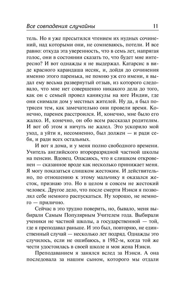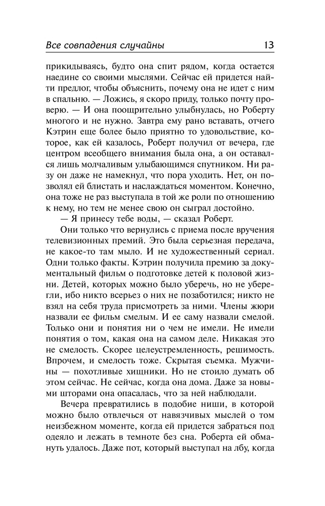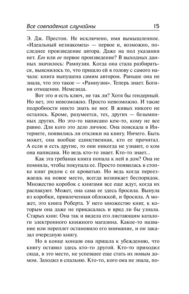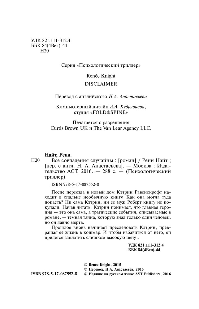 Все совпадения случайныВ данный момент этот товар отсутствует в продаже. Возможно, у нас найдется аналогичный или похожий товар здесь. Серия: Психологический триллер После переезда в новый дом Кэтрин Равенскрофт находит в спальне необычную книгу. Как она могла туда попасть? Ни сама Кэтрин, ни ее муж Роберт книгу не покупали. Начав читать, Кэтрин понимает, что главная героиня — это она сама, а трагические события, описываемые в романе, — темная тайна, которую знал только один человек, но он давно мертв. |