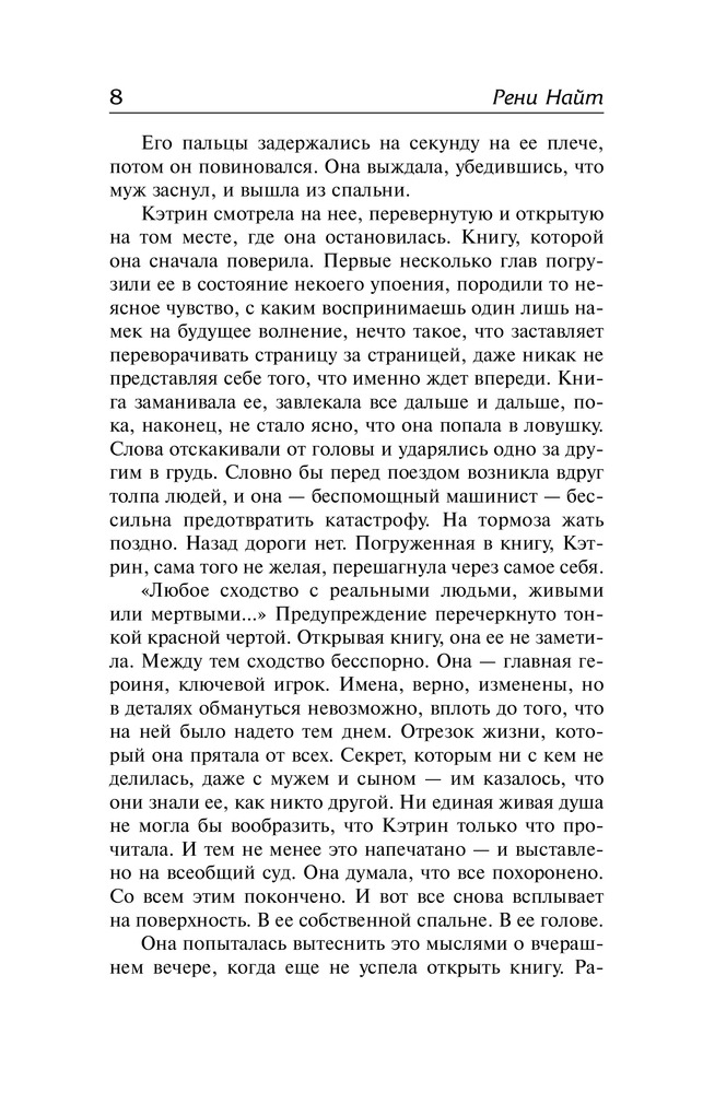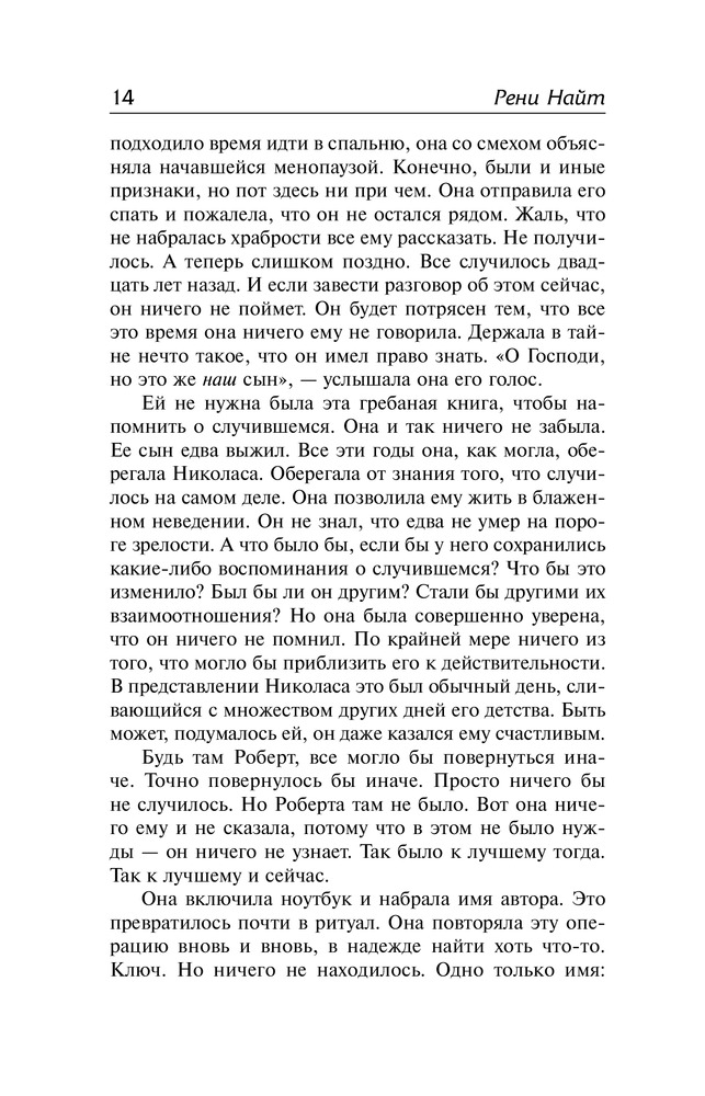 Это просто твердая 5! Прочитав описание, я ожидала что-то мистическое, связанное с книгой-убийцей или тому подобное, но нет - я получила психологический-триллер! Действительно триллер и действительно психологический! На первом месте здесь "идеализация" детей своими матерями, бесконечная любовь, понятие, что "её деточка самый лучший", боль от потери, закрытие глаз на многие детали, которые по сути пугают. Автору потрясающе удалось вывести меня на эмоции. Я ненавидела главную героиню процентов 80 из всей книги! Я ругалась на неё, презирала и радовалась, когда ей вредили, а потом, потом ой... неожиданно конечно! Два разных сына - две абсолютно одинаковые материнские любви. Две разные версии "правды". Держит в напряжении до самого конца, хотя ближе к концу начинаешь догадываться о том, что же произошло - это не портит абсолютно ничего! Легкими, короткими, но емкими словами Рени Найт затягивает вас в пучину событий, манит и гипнотизирует, не отпускает до самого последнего предложения.