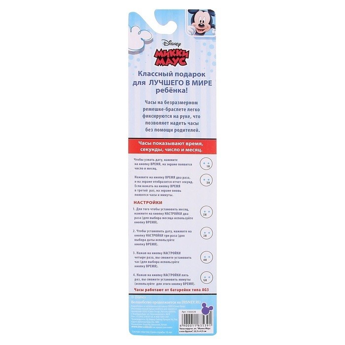 Disney Часы наручные электронные «Микки Маус и его друзья»В данный момент этот товар отсутствует в продаже. Возможно, у нас найдется аналогичный или похожий товар здесь. Серия: Микки Маус и друзья Все дети хотят поскорее повзрослеть, иметь свою машину, мобильный телефон и, конечно же, наручные часы, как у мамы и папы. Подарите чаду часы наручные электронные «Микки Маус и его друзья» с изображением любимых героев Disney, и он будет прыгать от восторга! Все друзья будут завидовать такому красивому и функциональному аксессуару, а ребёнок научится следить за временем. Дети быстро растут, а благодаря безразмерному |