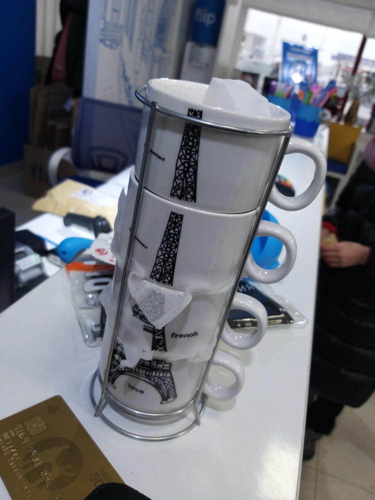 Указанный объем в 240 мл. слишком далек от реальности. Кружка является кофейной и вмещает в себя максимально 180 мл. На кружках был заводской брак в виде выпуклостей. Подставка со временем оставит следы на кружках т.к. они входят в нее с трудом (черные следы от подставки уже можно разглядеть на белой поверхности чашки)