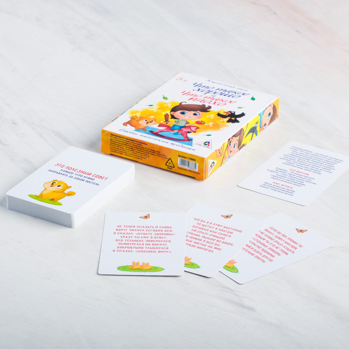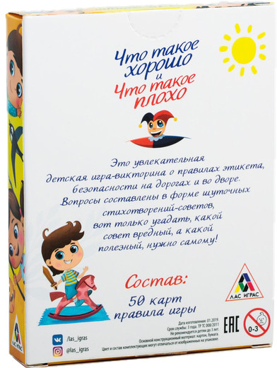 Лас Играс Игра карточная «Что такое хорошо, что такое плохо»В данный момент этот товар отсутствует в продаже. Возможно, у нас найдется аналогичный или похожий товар здесь. Игра «Что такое хорошо, что такое плохо» — это увлекательная викторина о правилах этикета, безопасности на дорогах и во дворе. Все вопросы написаны в форме шуточных стишков-советов. Отгадать, какой из них вредный, а какой полезный, малышу предстоит самому! Внутри вы найдёте 50 карточек с советами. Прочитайте их и скажите, стоит ли вести себя так, как говорится в стишке, или нужно сделать по-другому. Если игрок отгадал, он забирает стишок себе. А если нет — увы, остаётся ни с чем. Все правильные ответы есть на обороте карточки, смотрите их и узнавайте новое! Играть интересно как самостоятельно, так и в весёлой компании. А победит участник или команда, у которых будет больше всего карточек к концу игры! |