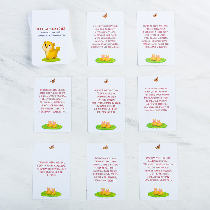 Эта игра носит выраженный обучающий характер. Она подсказывает какие ситуации обсудить с ребенком и совместно решить, почему надо поступать так или иначе. На карточках нарисованы забавные котики. Некоторые стихи очень смешные. ))