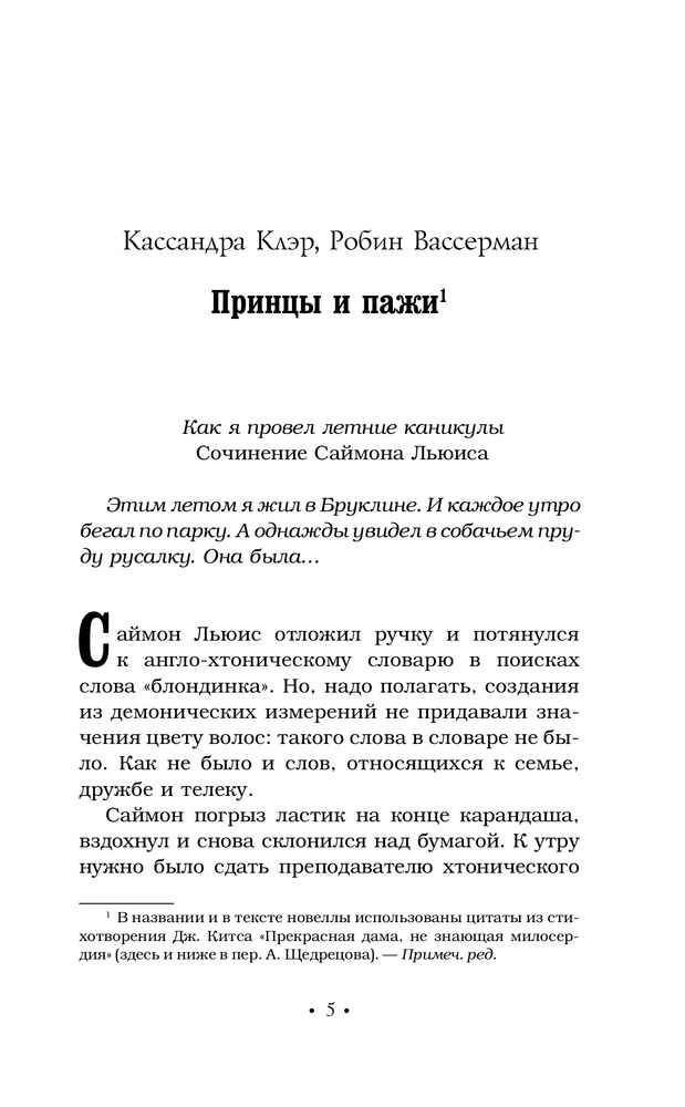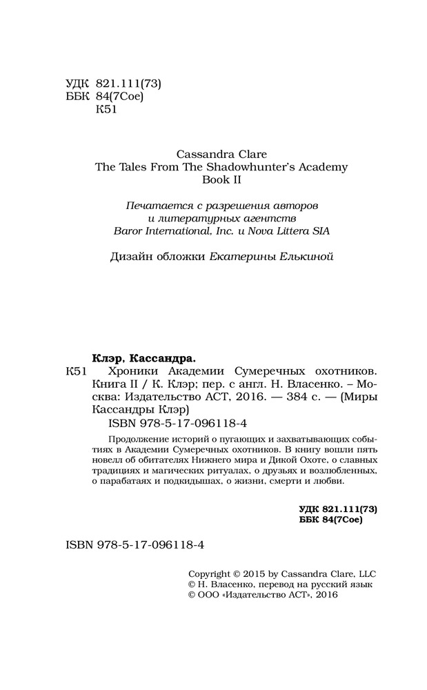В данный момент этот товар отсутствует в продаже. Возможно, у нас найдется аналогичный или похожий товар здесь. Серия: Миры Кассандры Клэр Продолжение историй о пугающих и захватывающих событиях в Академии Сумеречных охотников. В книгу вошли пять новелл о том, как рождались легенды об обитателях Нижнего мира и Дикой Охоте, о славных традициях и магических ритуалах, о друзьях и возлюбленных, о парабатаях и подкидышах, о жизни, смерти и любви. |