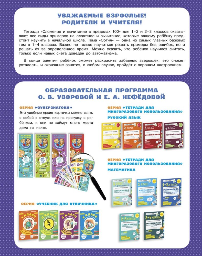 Математика. 2-3 класс. Сложение и вычитание в пределах 100 и 1000Ольга Васильевна Узорова, Елена Алексеевна Нефедова В данный момент этот товар отсутствует в продаже. Возможно, у нас найдется аналогичный или похожий товар здесь. Серия: Узорова О., Нефедова Е. Многоразовые тетради по основным предметам Темы: Сложение и вычитание в пределах 100 (с переходом через десяток). Сложение и вычитание в пределах 1000 (нумерационные случаи). |
