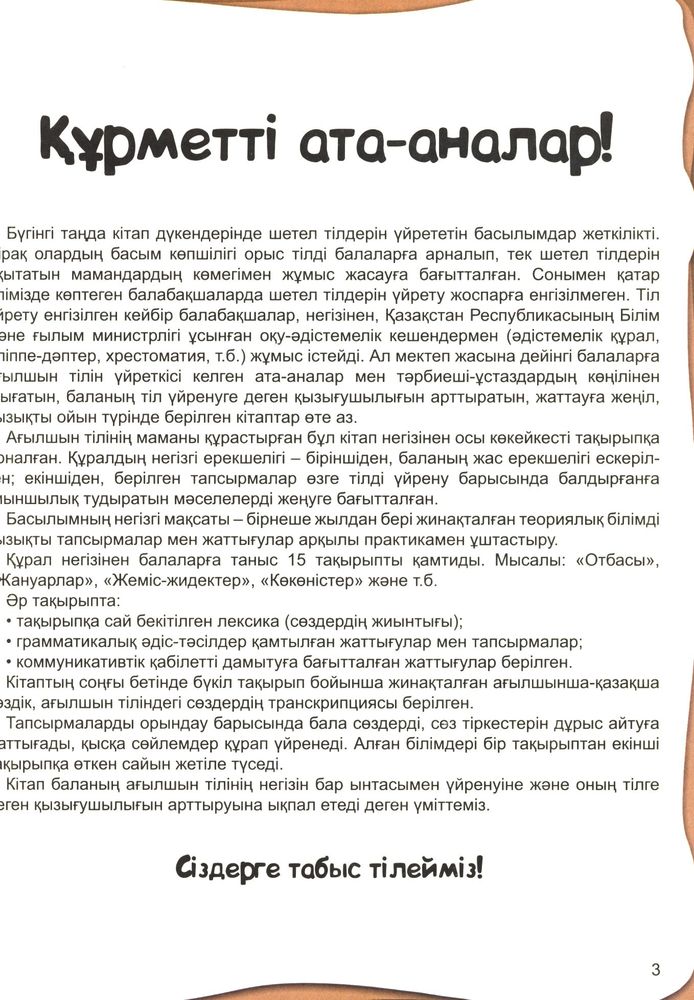 Хорошая книга для дополнительного изучения языка с детьми дошкольниками и младшего, школьного возраста. Красочные картинки, хорошее качество книги. Мало таких книг, именно на казахском языке. Детям понравилось. Советую всем!