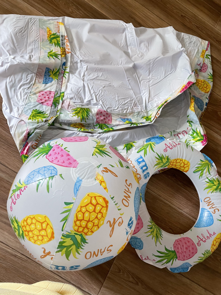 Накачали мяч и круг, мяч достаточно большой. Небольшой запах есть, думаю не критично, выветрится.