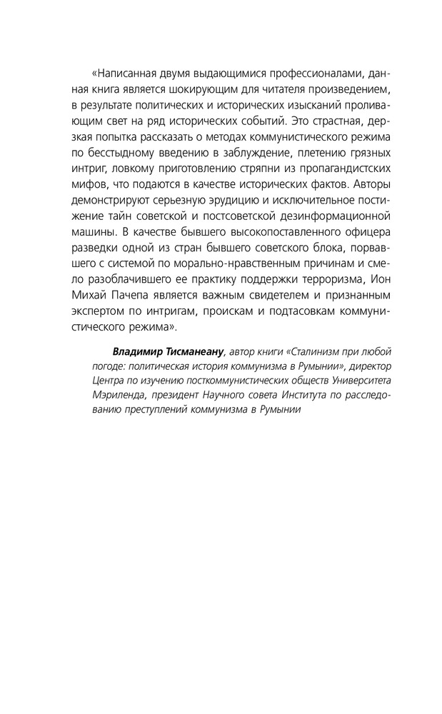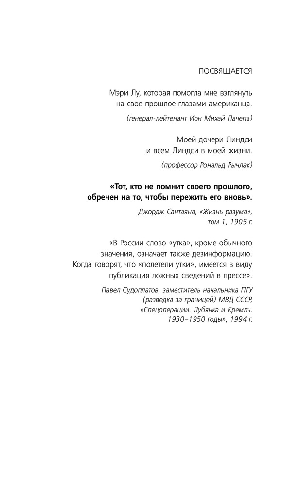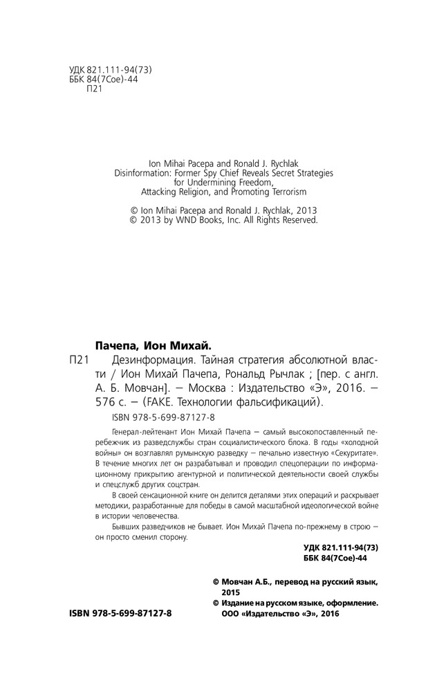 Генерал-лейтенант Ион Михай Пачепа — самый высокопоставленный перебежчик из разведслужбы стран социалистического блока. В годы «холодной войны» он возглавлял румынскую разведку — печально известную «Секуритате». В течение многих лет он разрабатывал и проводил спецоперации по информационному прикрытию агентурной и политической деятельности своей службы и спецслужб других соцстран. В своей сенсационной книге он делится деталями этих операций и раскрывает методики, разработанные для победы в самой масштабной идеологической войне в истории человечества. Бывших разведчиков не бывает. Ион Михай Пачепа по-прежнему в строю — он просто сменил сторону.