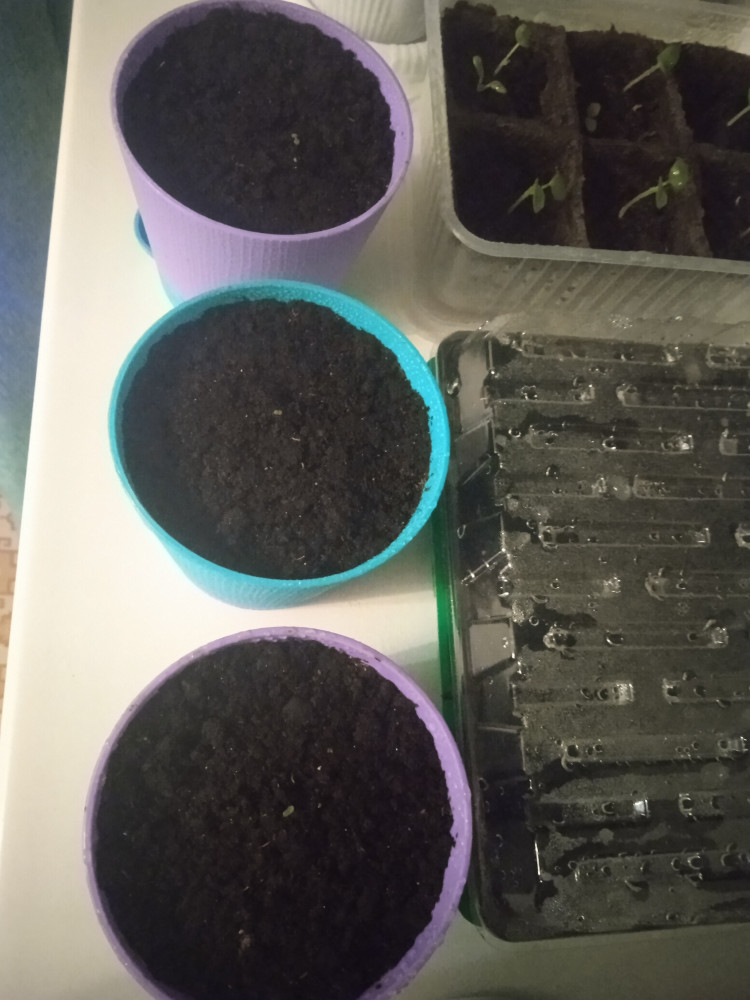 Взошли две в течение недели. Такие мелкие, что я их сначала даже не заметила. Думаю, другие 3 не взошли, либо потому, что у меня начали плесневеть торфяные стаканчики, либо потому, что я неправильно опрыскала их в начале и скорее всего загубила (написано, так делать нельзя - сажать надо поверх уже влажной земли, а потом только слегка опрыскивать мелкими капельками, потому что семена крохотные и должны всегда лежать на поверхности под пленкой). Как взошли, убрала ростки из под пленки. Надеюсь теперь, что не погибнут. При пересадке чуть не потеряла один росток - настолько они крохотные, будто острие иголки. На фоне остальной моей рассады их вообще не видно) На фото ростки в цветных горшках на фоне огромной пеларгонии того же времени посадки