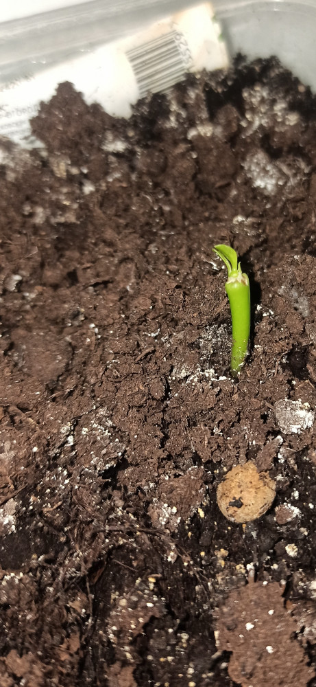 из трёх семечек взошло одно. стоял как палочка, сейчас уже два листика на макушке выросло.