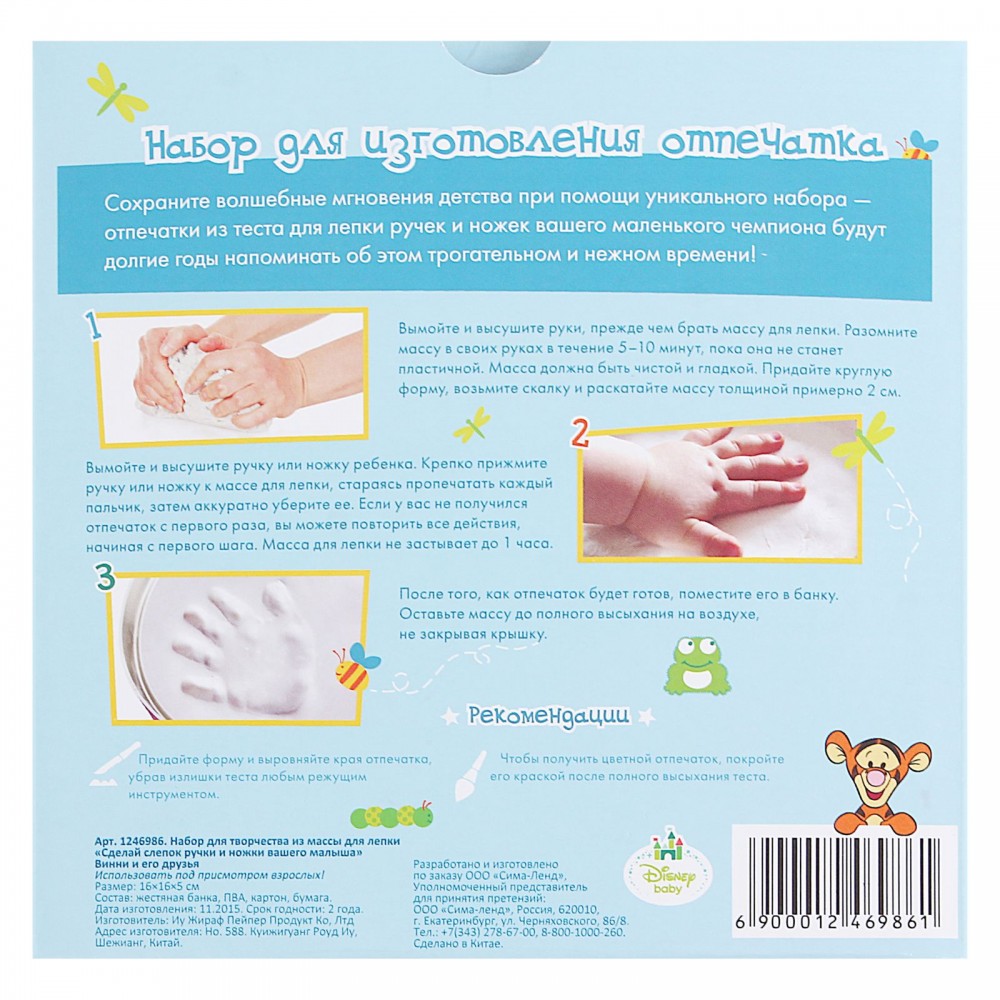 Disney Набор «Сделай слепок ручки и ножки вашей малыша»В данный момент этот товар отсутствует в продаже. Возможно, у нас найдется аналогичный или похожий товар здесь. Серия: Медвежонок Винни и его друзья Так важно сохранить самые тёплые воспоминания! Особенно этого хочется молодым мамам и папам, которые обожают своего малыша и просто не могут отвести от него глаз. Специально для таких родителей мы разработали настоящее чудо, способное запечатлеть мгновения счастья — набор для создания слепков. Теперь отпечатки маленьких ручек и ножек останутся с вами навсегда! Создать такое сокровище очень просто: разомните массу для лепки, раскатайте слой в 2 сантиметра и отпечатайте ножку или ручку малыша. Придайте форму и оставьте на час сохнуть на открытом воздухе. Если с первого раза не получилось — повторите действия, пока масса не засохла. Слепок можно покрасить и вставить в рамку или создать целую композицию-коллаж. Он украсит стену, стол, фотоальбом или коробку памятных вещей. |