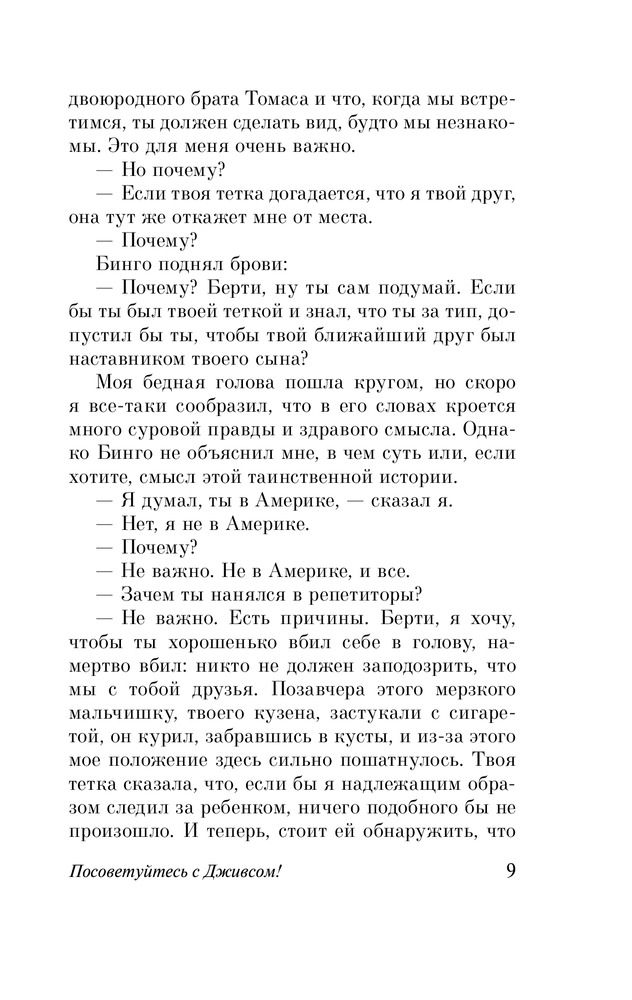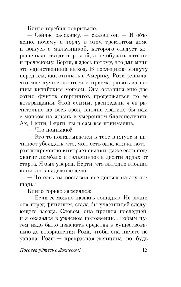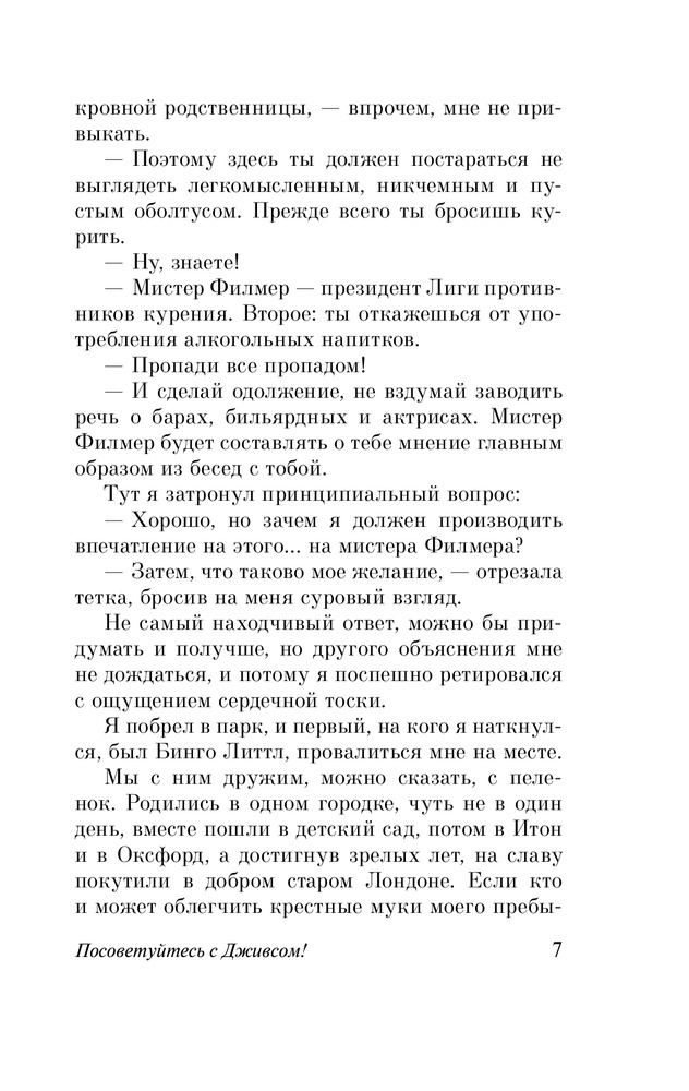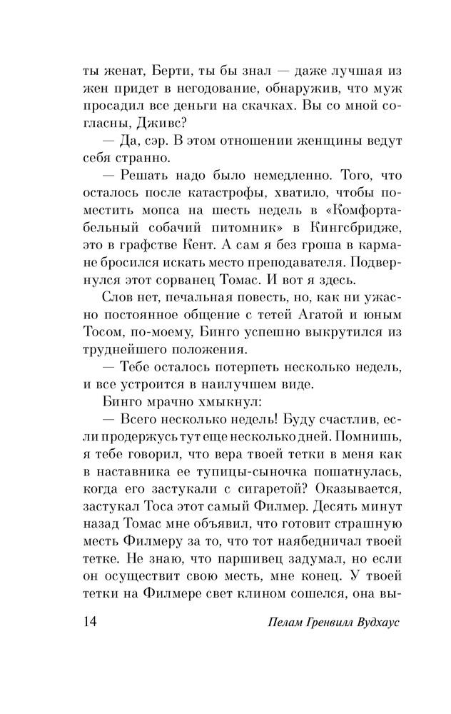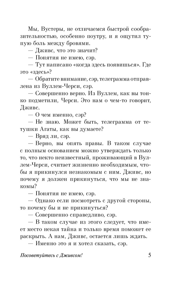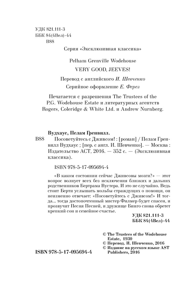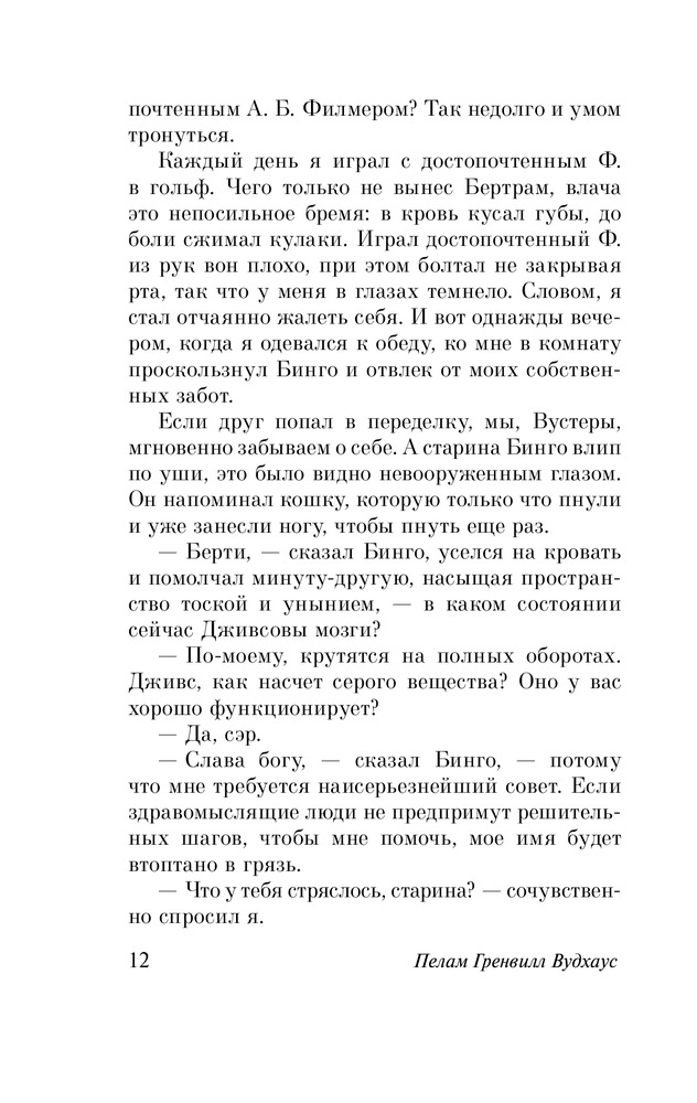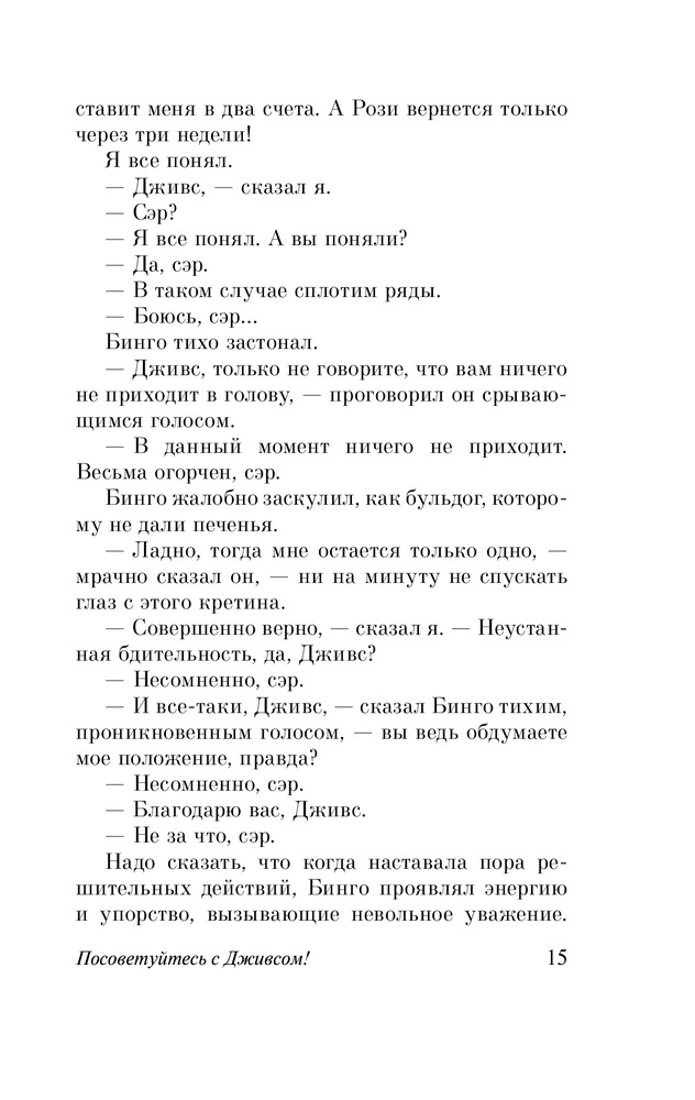 Серия: Эксклюзивная классика «В каком состоянии сейчас Дживсовы мозги?» — этот вопрос волнует всех без исключения близких и дальних родственников Бертрама Вустера. И это не случайно. Ведь стоит Берти услышать мольбы страждущих о помощи, он неизменно отвечает: «Посоветуйтесь с Дживсом!» И тогда, тогда достопочтенный мистер Филмер будет спасен, и прозвучит Песня Песней, и дружище Бинго снова обретет крепкий сон и семейное счастье. |
