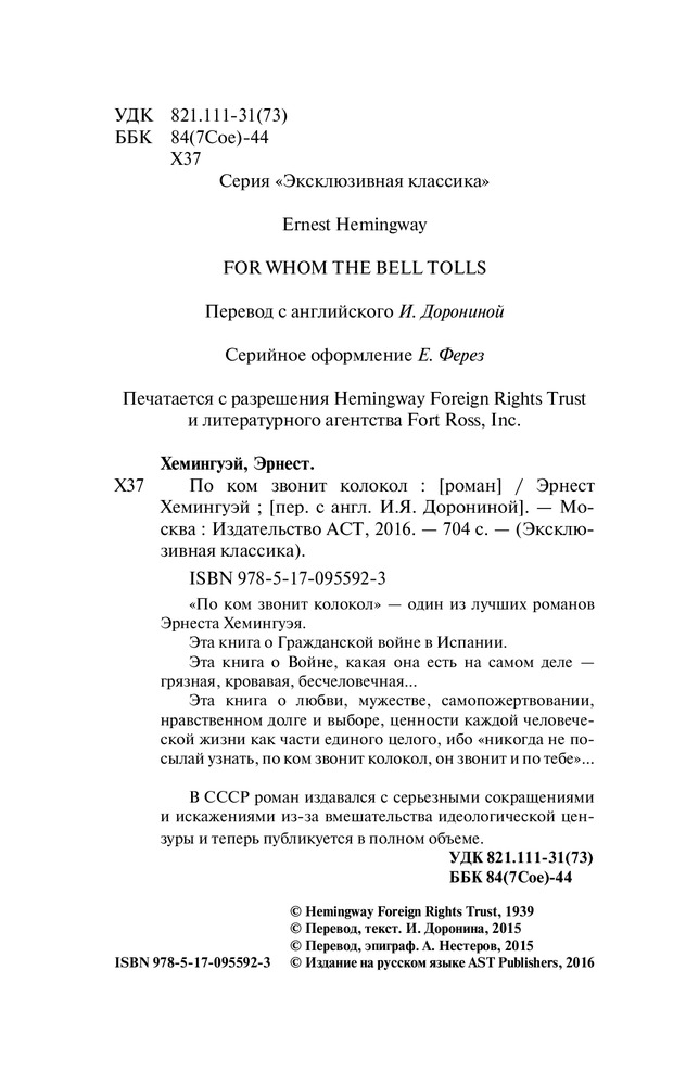 💳 Оплатить за товар можно при получении 🇰🇿 Есть бесплатная доставка по Казахстану от 1 дня 🎁 Копите бонусы с каждой покупки Серия: Эксклюзивная классика «По ком звонит колокол» — один из лучших романов Эрнеста Хемингуэя. |