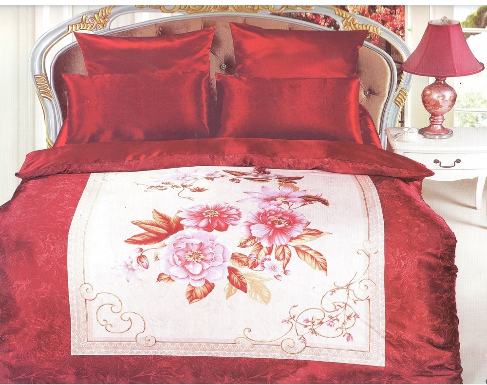 Лицевая сторона пододеяльника выполнена из купонного шелка с 3D рисунком, изнанка пододеяльника, простыня и наволочки - из однотонного искусственного шелка.