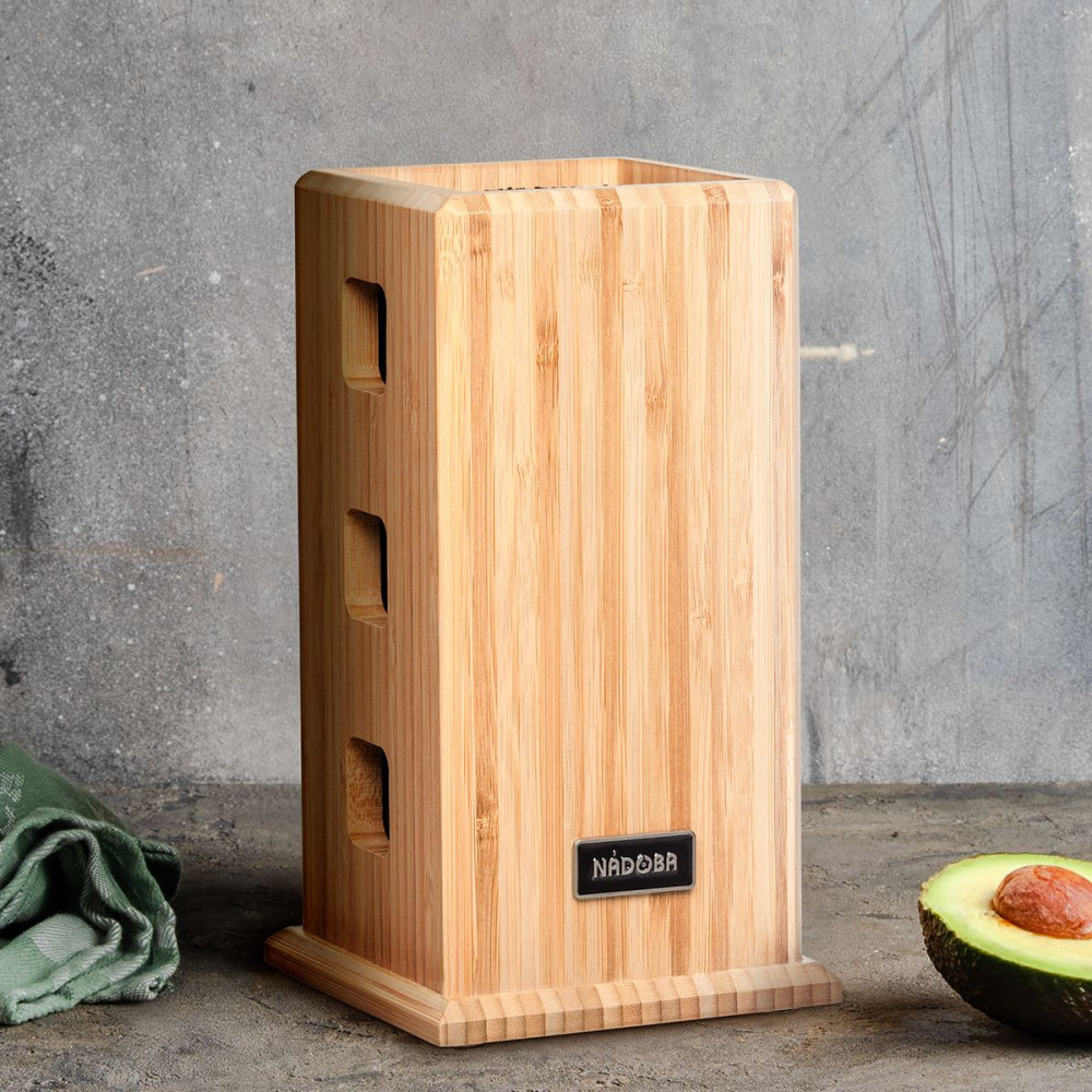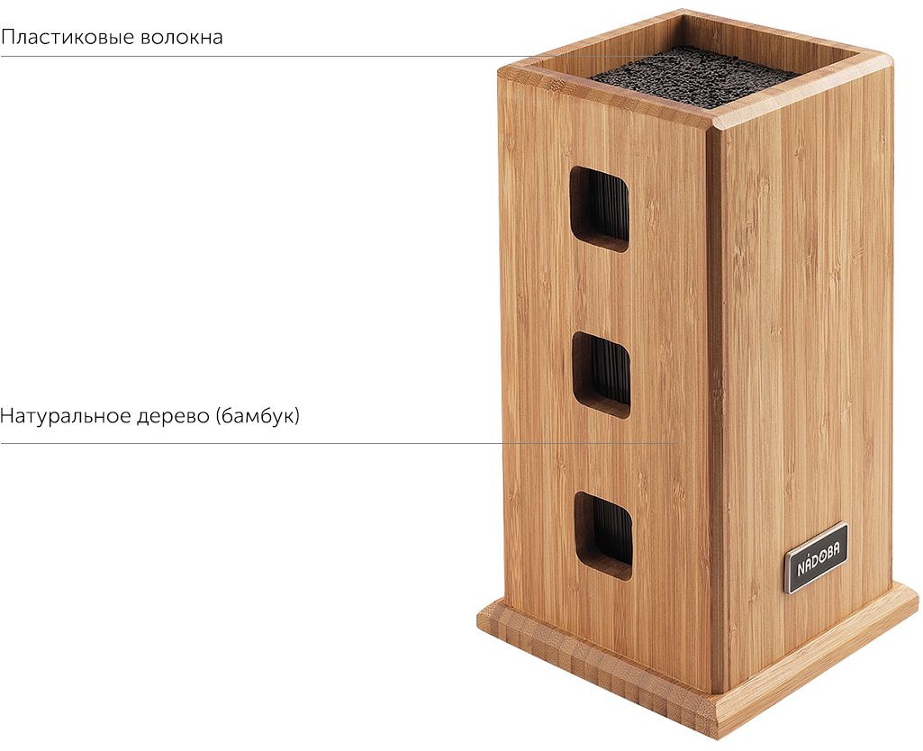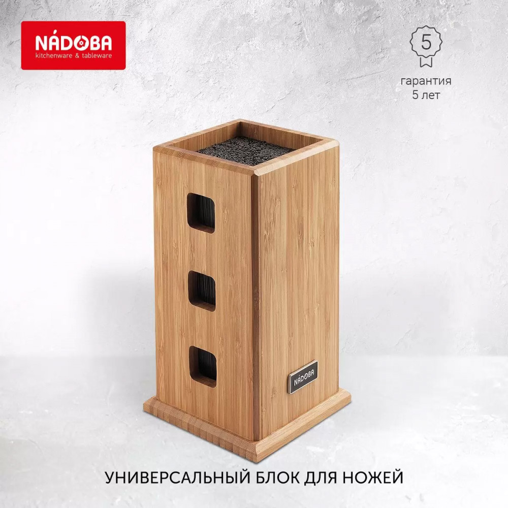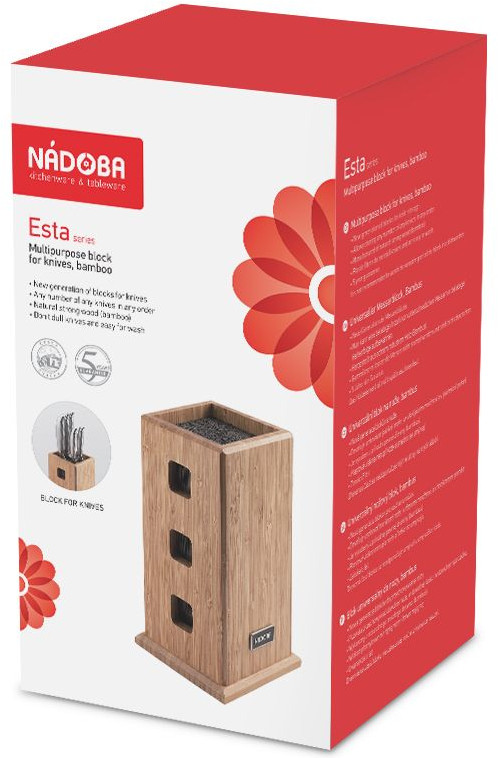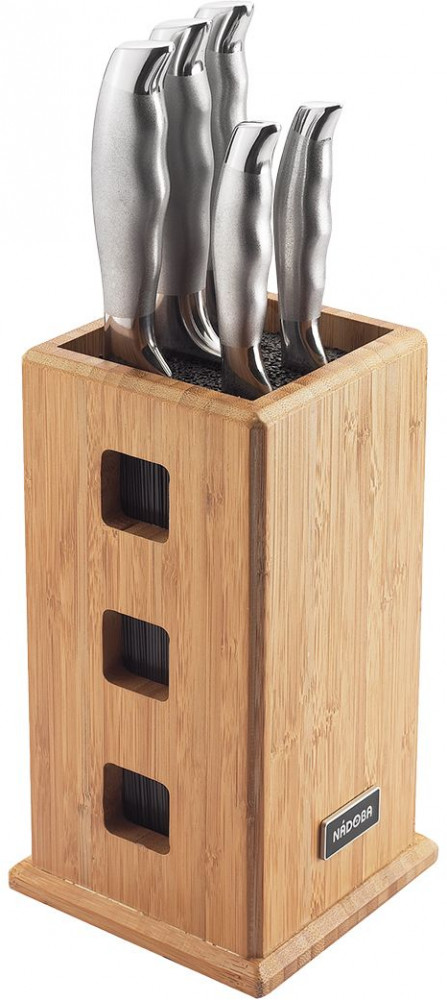 Nadoba Подставка для ножейнет запаха стиль качество В данный момент этот товар отсутствует в продаже. Возможно, у нас найдется аналогичный или похожий товар здесь. Серия: Esta Подставка для ножей Nadoba «Esta» отлично дополнит интерьер вашей кухни. Корпус выполнен из натурального прочного дерева (бамбук). Наполнитель в виде пластиковой щетки гигиеничен и вынимается без труда. Лезвия ножей при хранении не касаются друг друга, тем самым максимально сохраняя свою остроту. Подставка вместительная, в зависимости от размера ножи в ней свободно помещаются. Такая подставка станет прекрасным подарком, а ее изящный дизайн станет украшением кухни. Все гениальное просто! |