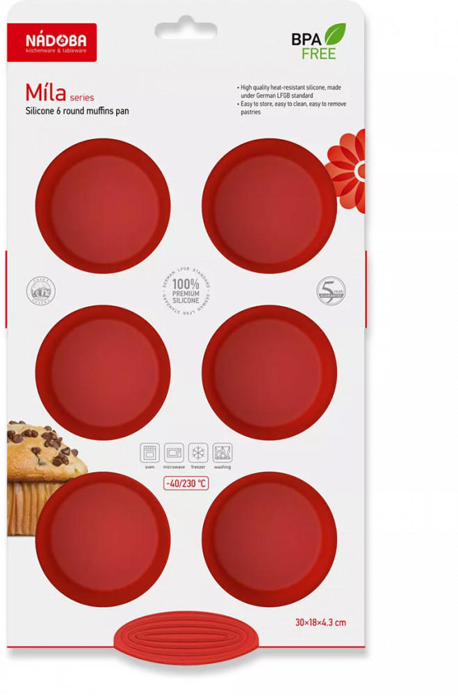 Nadoba Форма для выпечки «Mila»качество удобная форма цвет держится не прогорает В данный момент этот товар отсутствует в продаже. Возможно, у нас найдется аналогичный или похожий товар здесь. Серия: Mila Силиконовая форма для выпечки серии Míla изготовлена из высококачественного жаропрочного силикона, отвечающего самому строгому европейскому стандарту качества LFGB (Германия). Экологически безопасный материал — пищевой силикон BPA free не содержит вредных примесей, не вступает в реакцию с пищей, не впитывает запахи, характеризуется повышенными эксплуатационными свойствами. |