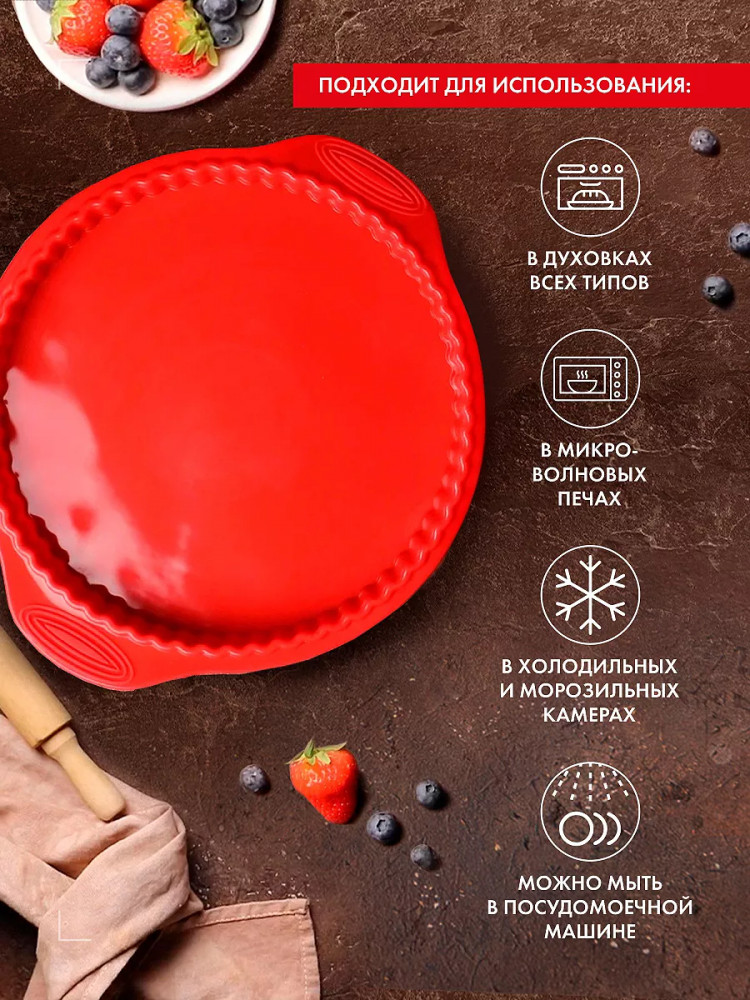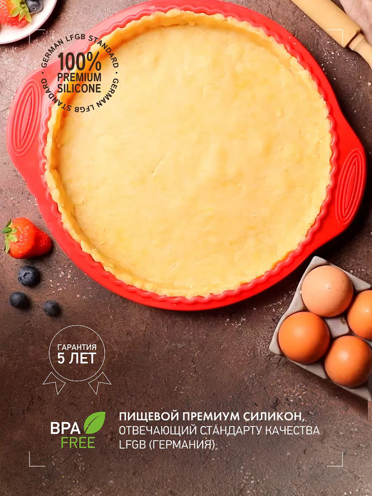 Отзыв не писала, пока не испробовала на деле. Хорошая форма. Прочный и гибкий силикон, не имеет посторонних запахов. Выпекала в этой форме и не большую пиццу и пироги и заливные и чизкейки. Ничего не подгорало и легко вынималось из формы. Легко моется. Рекомендую.