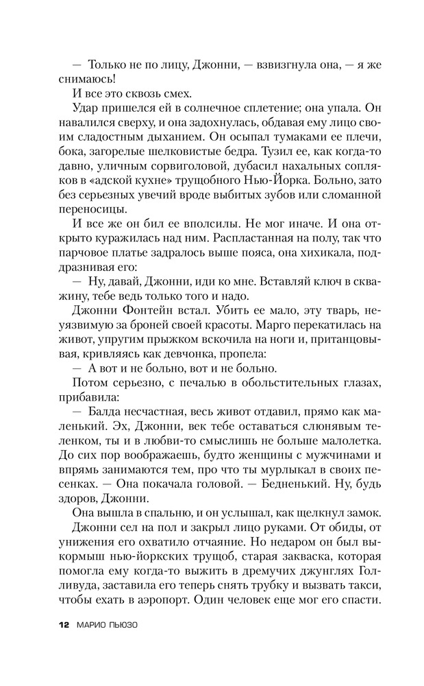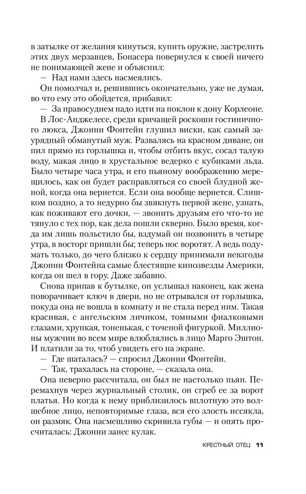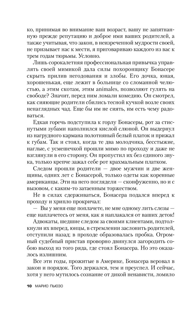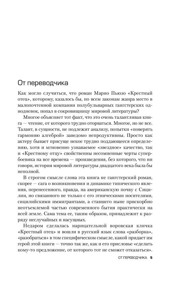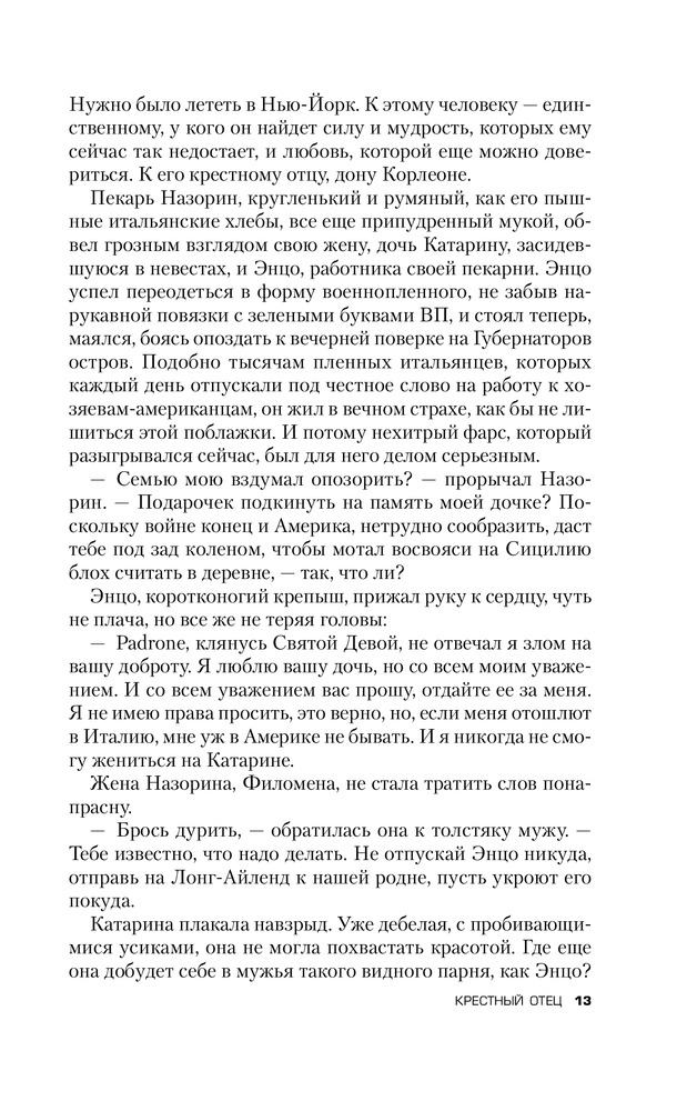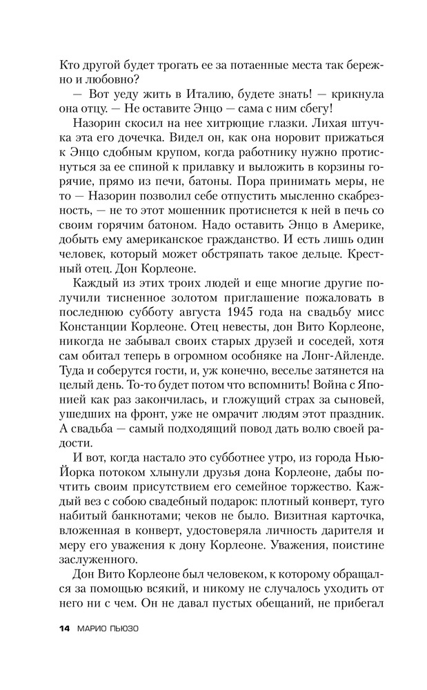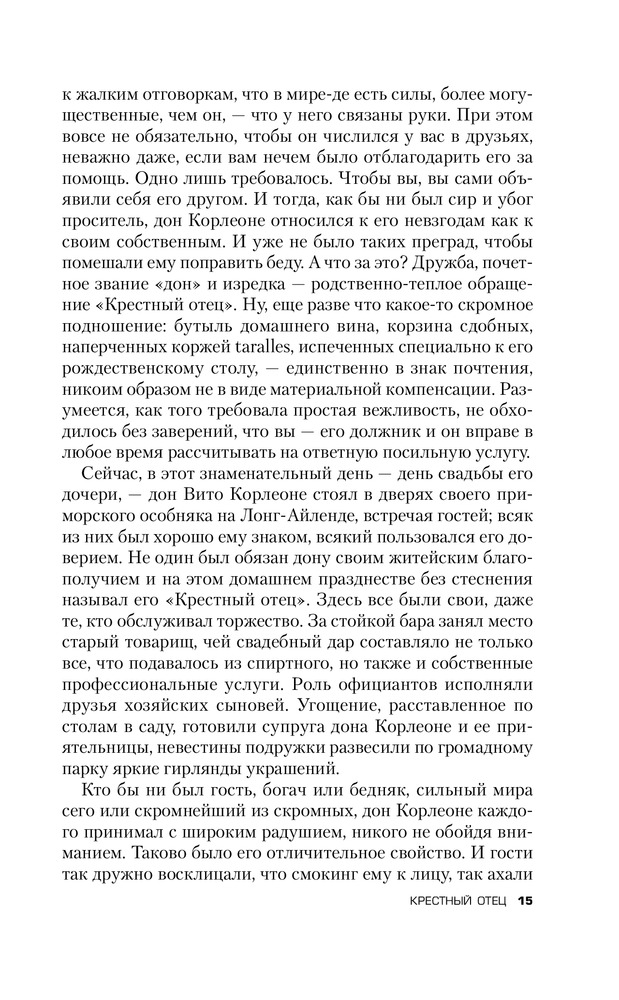 Для начала скажу что, увидев книгу в продаже, я сразу ее заказал, будучи уверен что книга раскроет или хотя бы дополнит мое представление о фильме. К сожалению... Увы. Банальная история. Скудный сюжет. Ничего особенного. Этот тот самый - редчайший случай, когда не КНИГА СДЕЛАЛА ФИЛЬМ, а ФИЛЬМ СДЕЛАЛ КНИГУ. Фильм как раз и открывает ту суть до которой так автор и не дошел. Именно от фильма возникает тот шарм, от которого все в восторге. Меня лично (это строжайше мое мнение) вообще книга не зацепила. Есть книги гораздо поучительнее (например "Последний дон" того же автора). Ну а конкретно по содержанию (вообще парадокс): добрый дедушка мороз, путем чести и достоинства помогая простым и добрым людям сделавший себе достояние, был сломлен кознями своих врагов. Его добрейший справедливейший сын во имя чести и достоинства, вместе с семейными традициями сделал всех. Соблюдая все традиции и поступая справедливо! Вы верите что такое может быть? Это просто сказка. P.S. Книга лишний раз романтизирующая криминал. От этого давным давно пора уже отходить. Пускай кто хочет на ней учится и попробует в жизни побыть таким красивым и прекрасным образом Дона и Макла Корлеоне. Надолго ли?