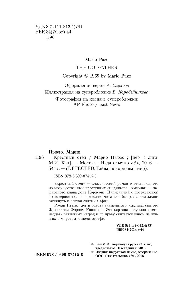 Крестный отецВ данный момент этот товар отсутствует в продаже. Возможно, у нас найдется аналогичный или похожий товар здесь. Серия: DETECTED. Тайна, покорившая мир «Крестный отец» — классический роман о жизни одного из могущественных преступных синдикатов Америки — мафиозном клане дона Корлеоне. Написанная с потрясающей достоверностью книга позволяет читателю без риска для жизни заглянуть в святая святых мафии. |