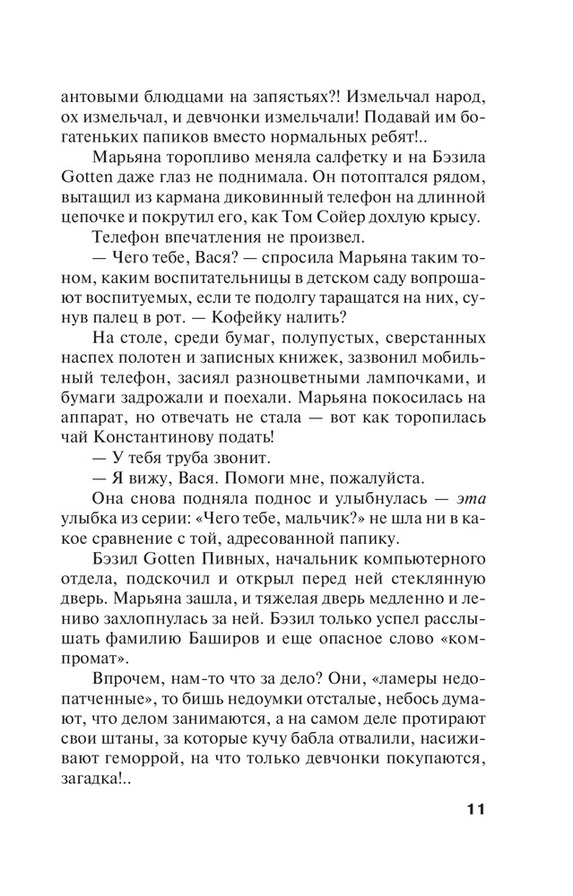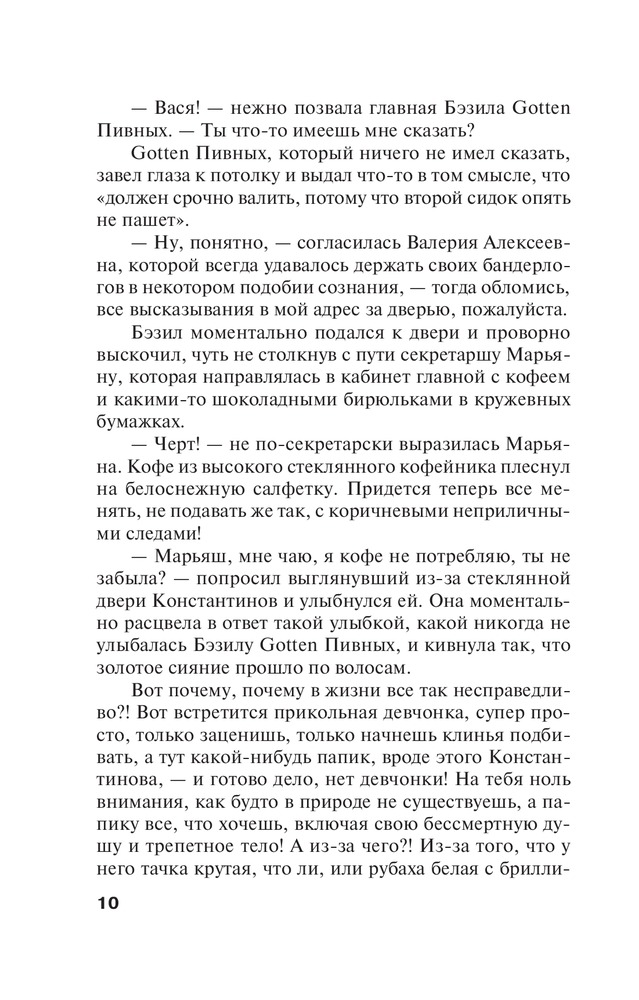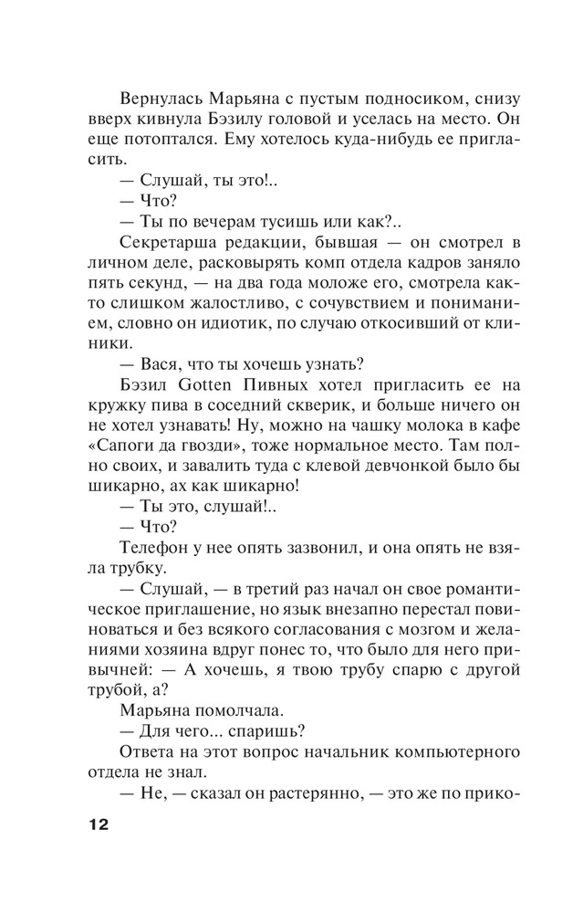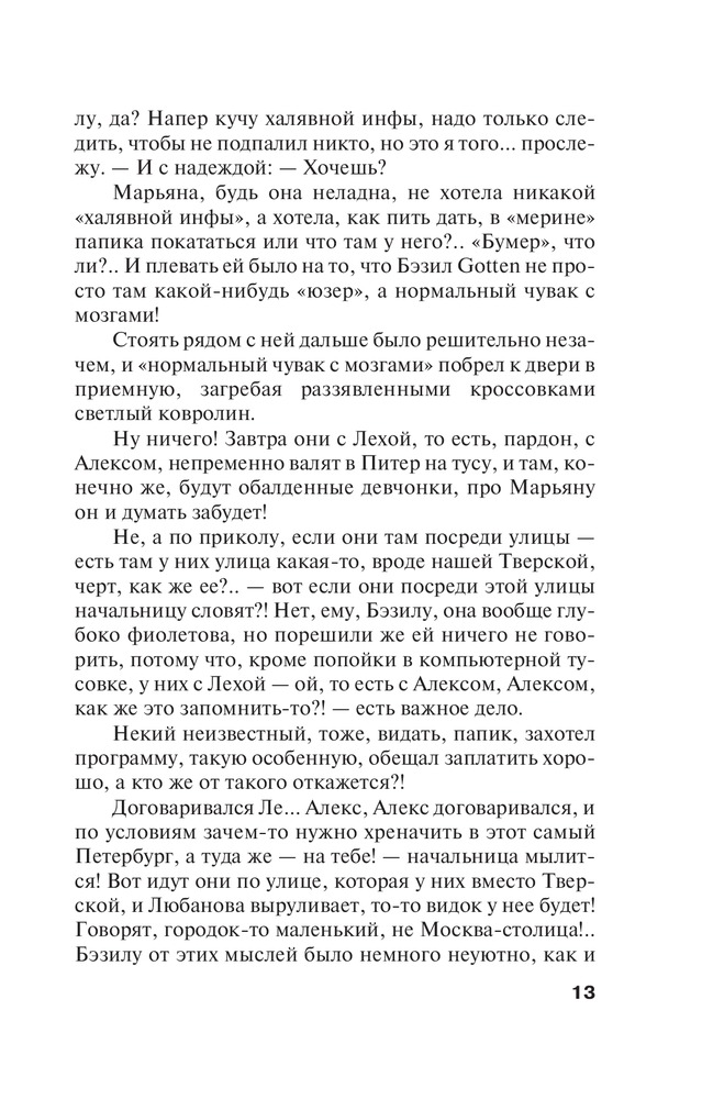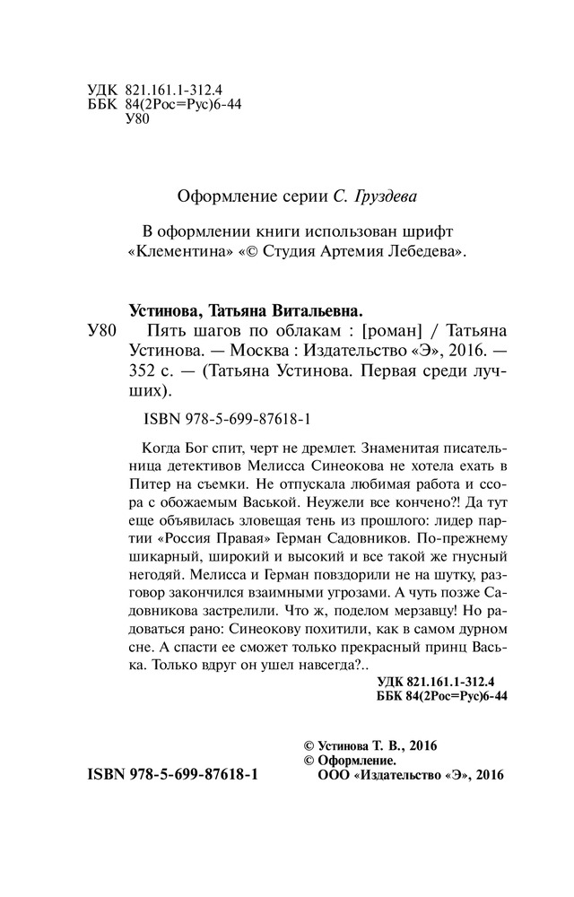 В данный момент этот товар отсутствует в продаже. Возможно, у нас найдется аналогичный или похожий товар здесь. Серия: Татьяна Устинова. Первая среди лучших (обложка) Когда Бог спит, черт не дремлет. Знаменитая детективная писательница Мелисса Синеокова не хотела ехать в Питер на съемки. Не отпускала любимая работа и ссора с обожаемым Васькой. Неужели все кончено?! Да тут еще объявилась зловещая тень из прошлого: лидер партии «Россия Правая» Герман Садовников. По-прежнему шикарный, широкий и высокий, и все такой же гнусный негодяй. Мелисса и Герман повздорили не на шутку, разговор закончился взаимными угрозами. А чуть позже Садовникова застрелили. Что ж, поделом мерзавцу! Но радоваться рано: Синеокову похитили, как в самом дурном сне. А спасти ее сможет только прекрасный принц Васька. Только вдруг он ушел навсегда? |