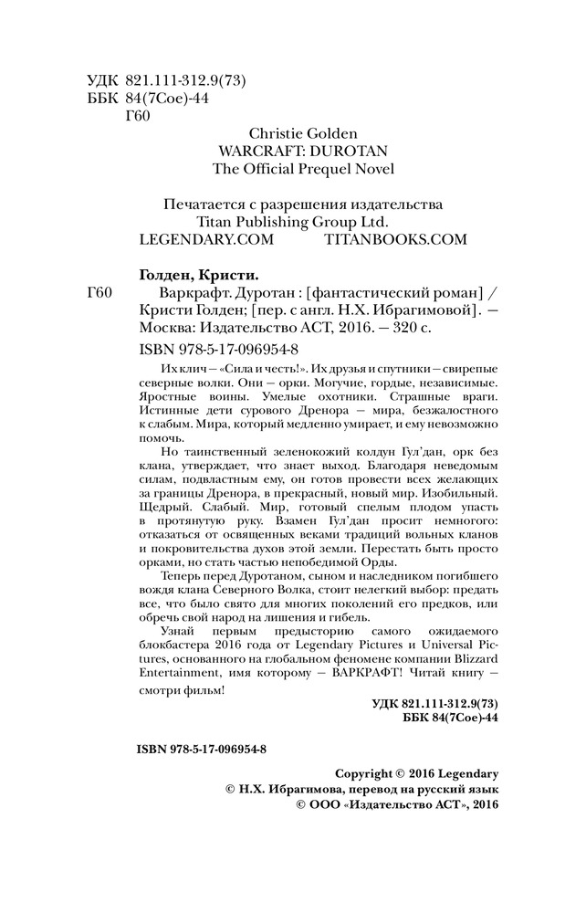 Отличная и очень интересная книга, но мне как человеку который играет в World of warcraft (меня поймут только такие люди) не понятно почему Blizzard так сказать разделяют вселенную игры и фильма (книга по фильму). В игре история Дуротана и клана Северных волков (на время жизни Дуротана) представляется немного иначе и это лично мне не нравится. А книга как сказано выше просто супер!