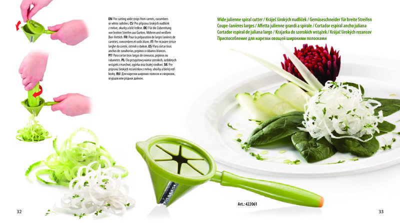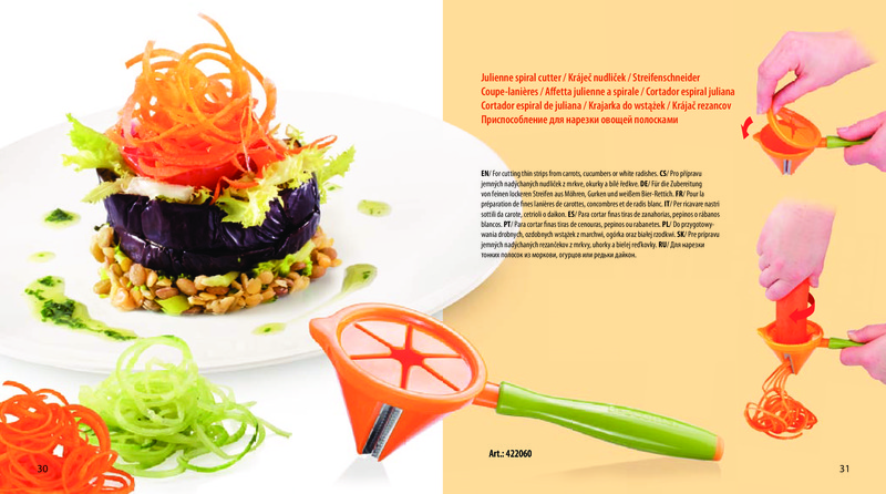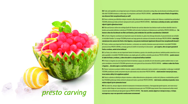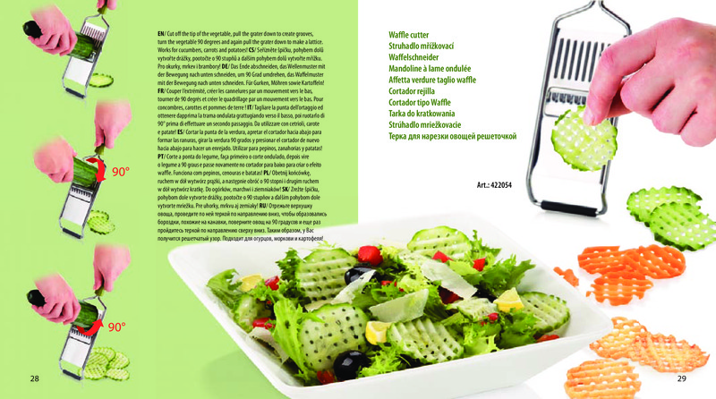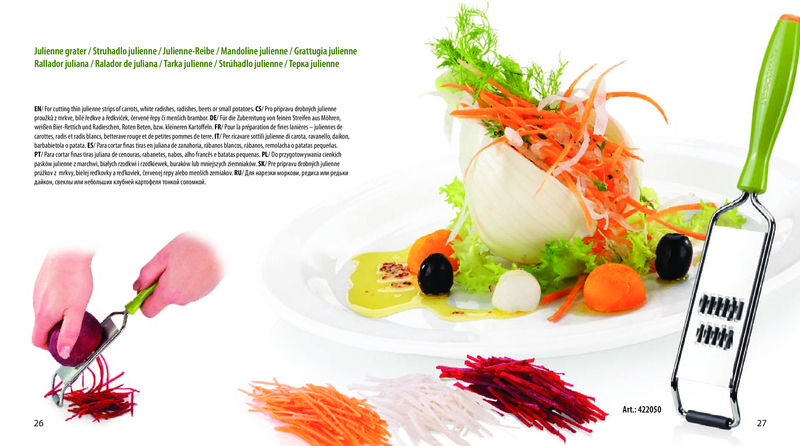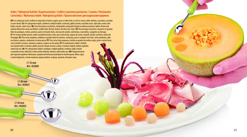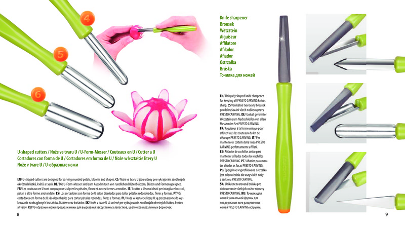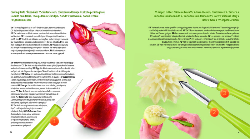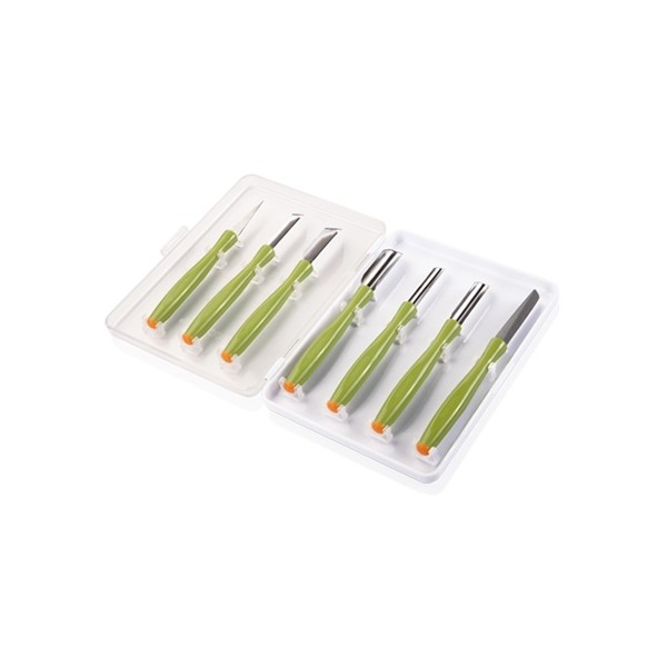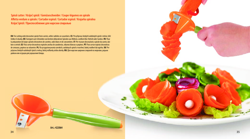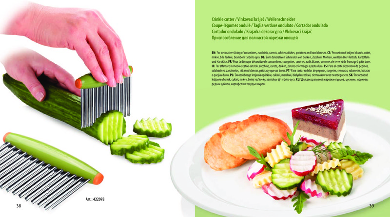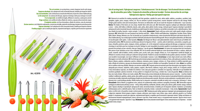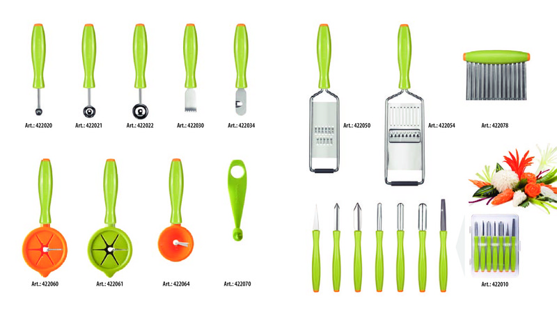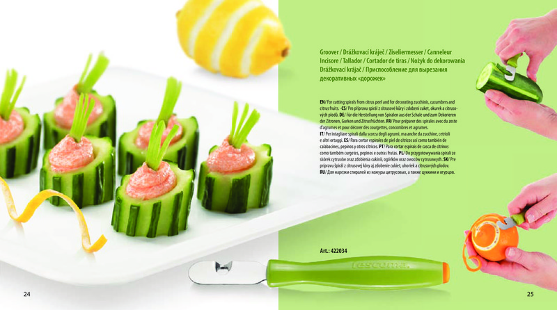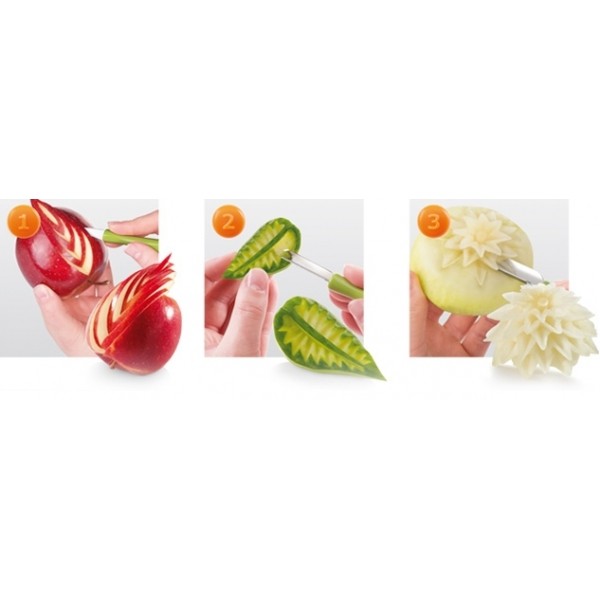 Tescoma Набор инструментов для фигурной нарезки «Presto»В данный момент этот товар отсутствует в продаже. Возможно, у нас найдется аналогичный или похожий товар здесь. Серия: Presto Carving Универсальный комплект идеально подходит для украшения фруктов и овощей -моркови, белой редьки и редиса, огурцов, кабачков, лука-порея, тыквы, яблок, груш, манго, дыни и т.п. В комплект входят 6 специальных ножей, керамический точильный камень и коробка для их безопасного хранения. Изготовлены из высококачественной нержавеющей стали и прочной пластмассы. Ножи можно мыть в посудомоечной машине, точилку и только что отточенные ножи мыть в посудомоечной машине нельзя. |