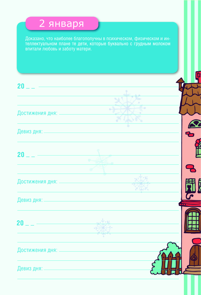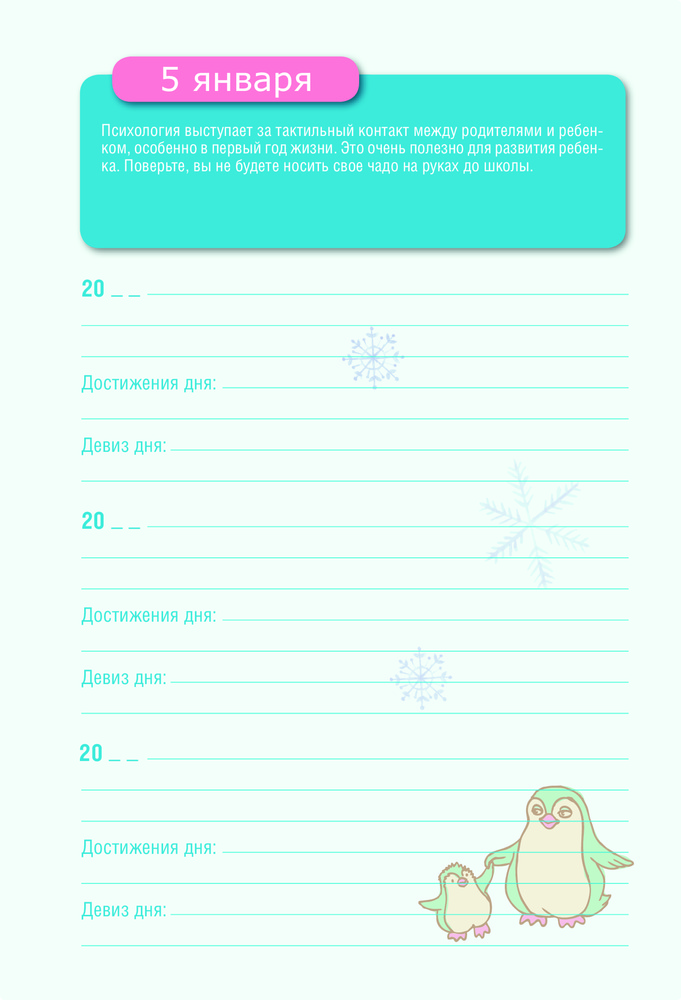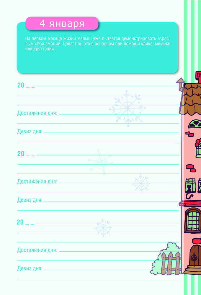 Каждая страница этого дневника — один день в проекции на три года. Вы сможете не только вспомнить события того же дня один или два года назад, но и понять, как выросла ваша кроха, как многому она научилась, как она растет и развивается!