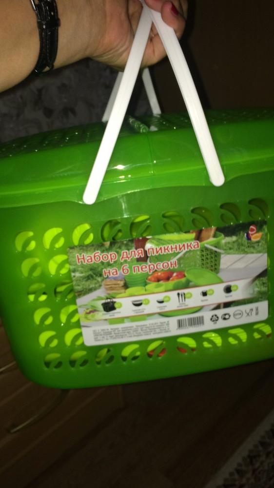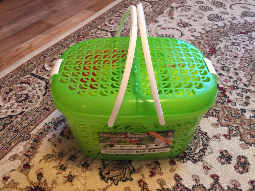 Шикарная корзинка для активного отдыха. Пластик без запаха, плотный. Корзина очень вместительная, кроме своей посуды ещё доложили другую. Очень довольна. В подарок идёт веер для раздува мангала.