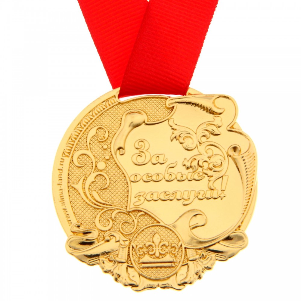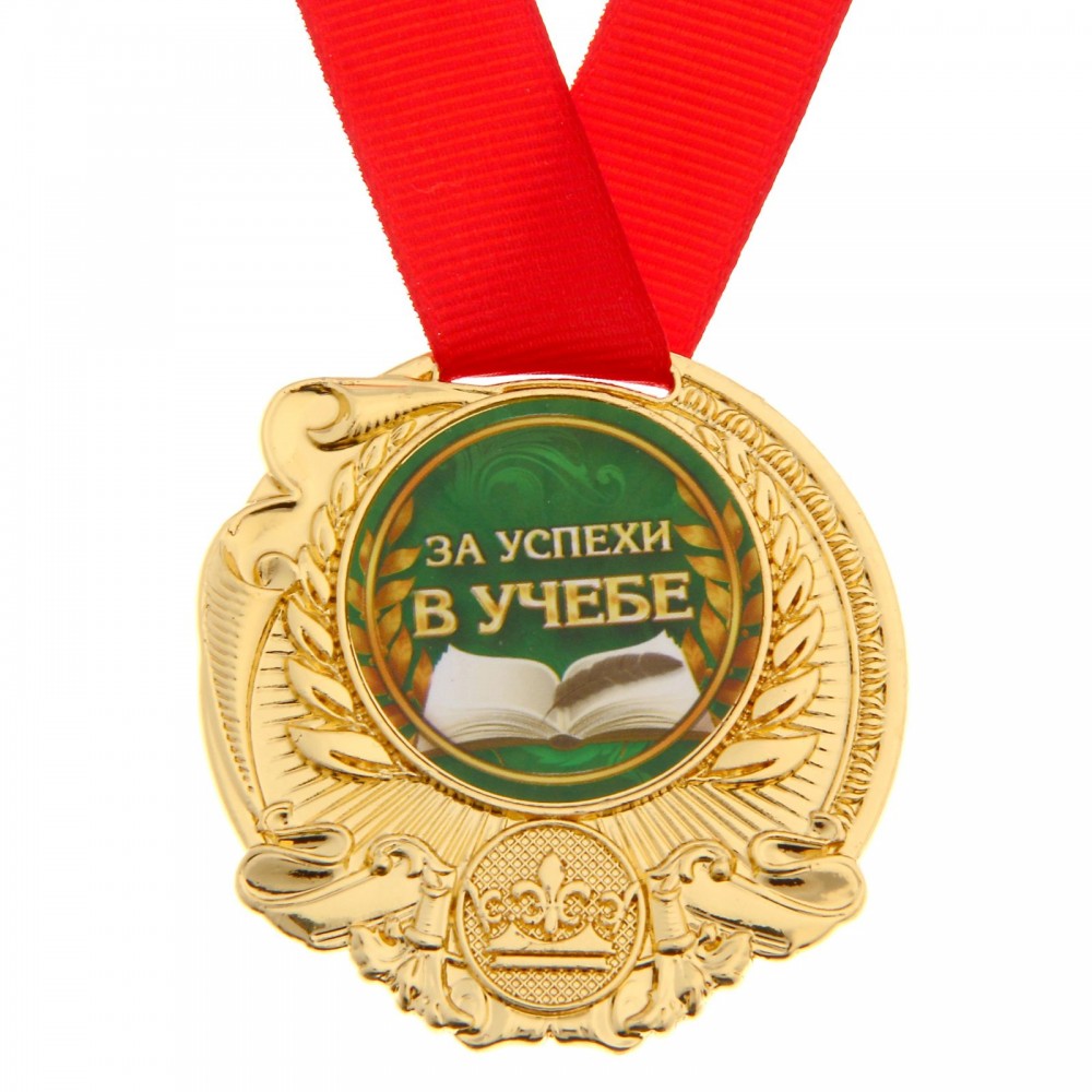 Медаль «За успехи в учебе», диаметром 5 см изготовлена из металла под золото. Лицевая и оборотная стороны украшены фигурными элементами. Вставка в центре диаметром 3,8 см сделана из бумаги с полноцветной печатью. Сувенир дополнен яркой красной лентой, благодаря которой награду можно сразу надеть на виновника торжества.