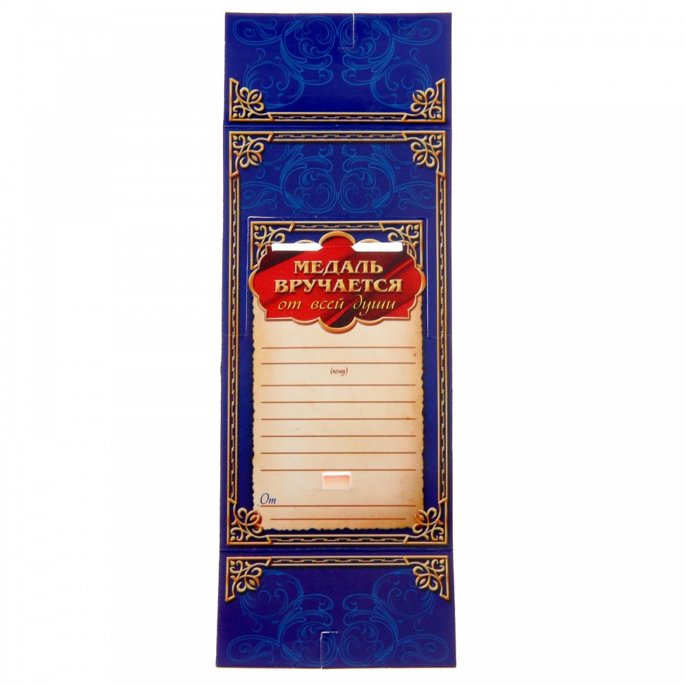 Медаль преподносится на яркой подарочной открытке с полями для имени адресата и пожеланий.