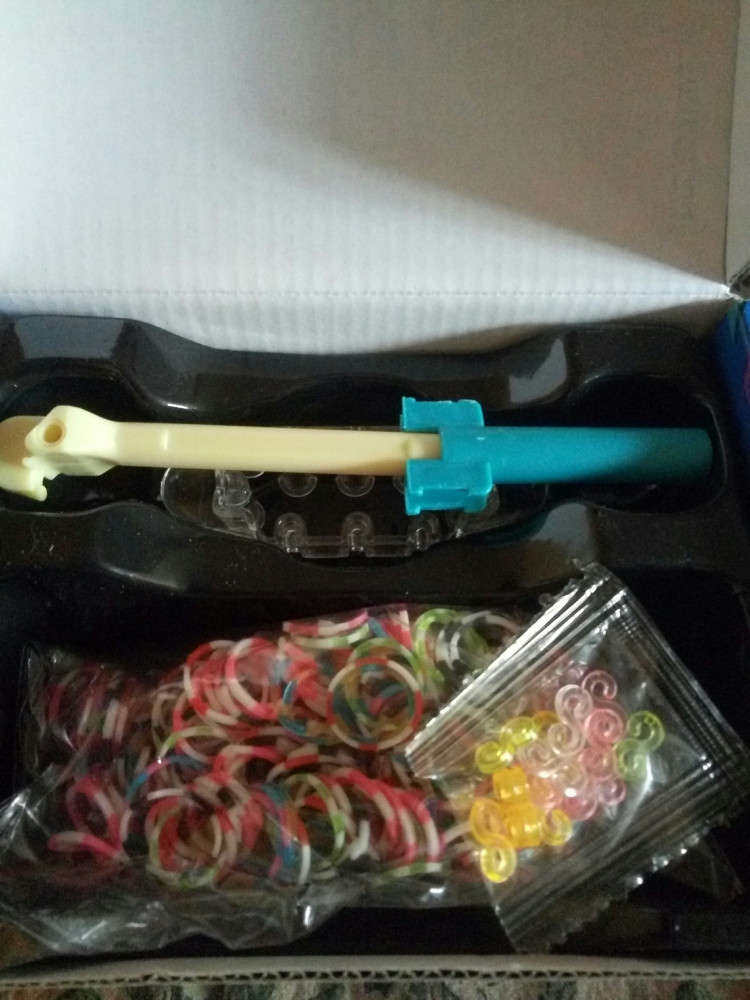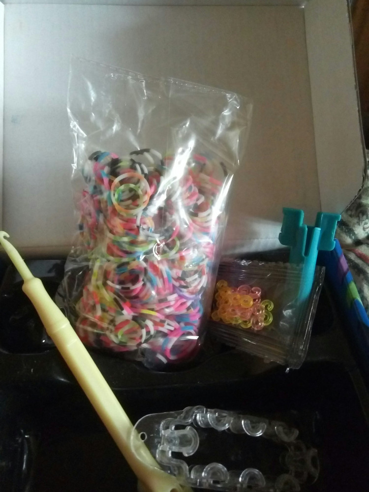 Очень классный наборчик! Порадовал) В нем пластиковый крючок, мини-станок, маленький станок, разноцветные S - клипсы и резиночки на удивление яркие, ровные, все вперемешку по цветам, но не слипшиеся нисколько! Замечательный набор!:)
