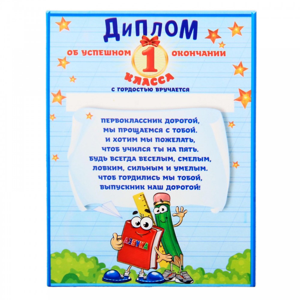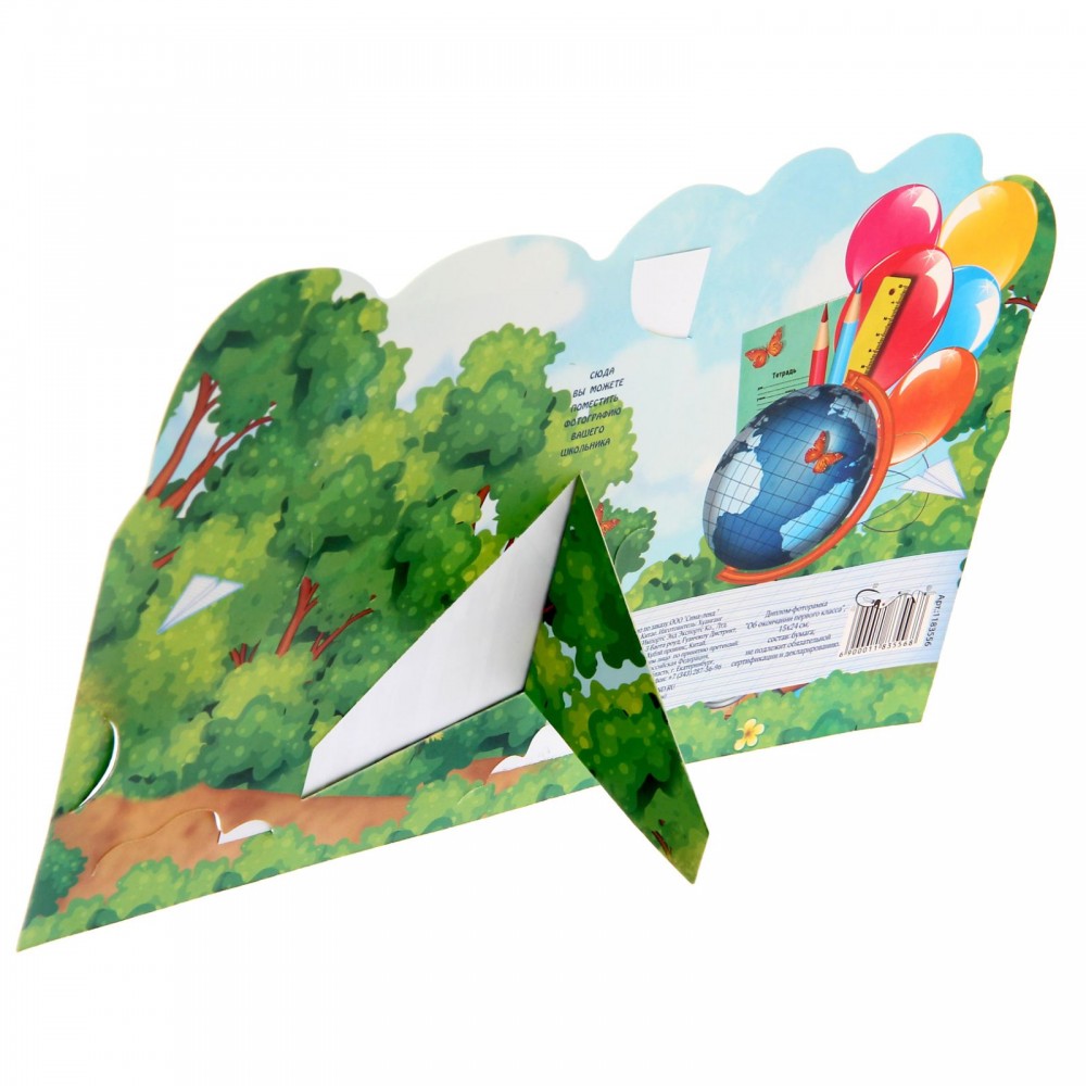 Яркая фоторамка дополнена специальной отгибающейся ножкой, которая позволит поставить её на самое видное место в доме или офисе. В дипломе об окончании первого класса можно написать личные пожелания на будущее. Красочная медаль с лентой подчеркнёт торжественность момента и будет гордо красоваться на груди маленького выпускника. Спустя годы будет так здорово посмотреть на снимок и вспомнить счастливые моменты беззаботного детства.