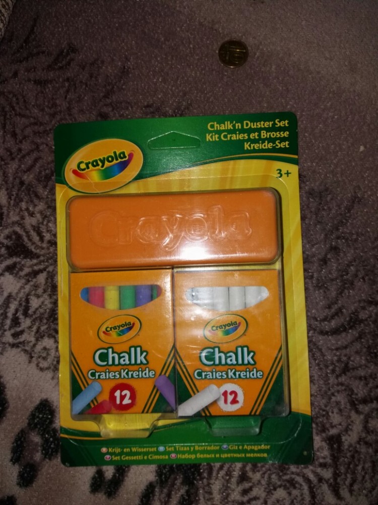 В упаковке губка, 12 белых и 12 цветных мелков.