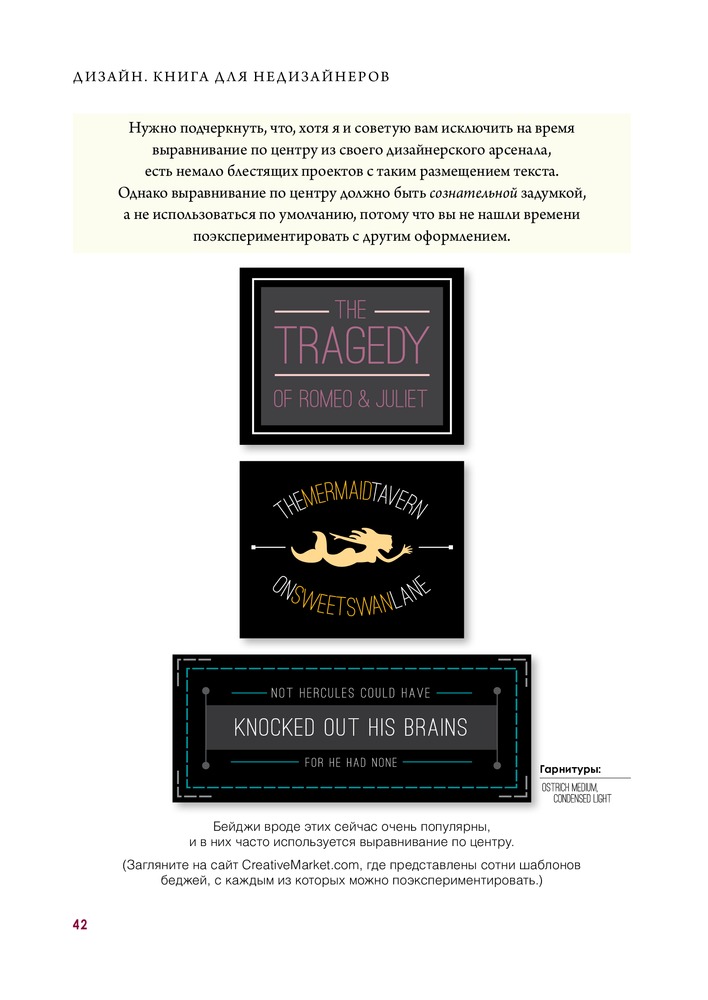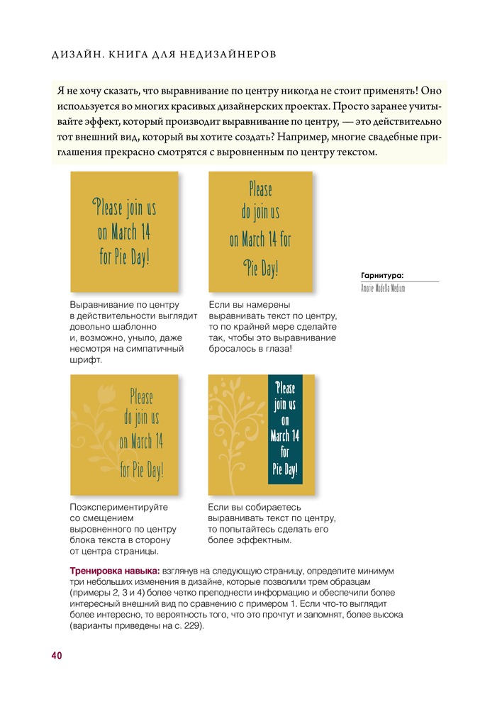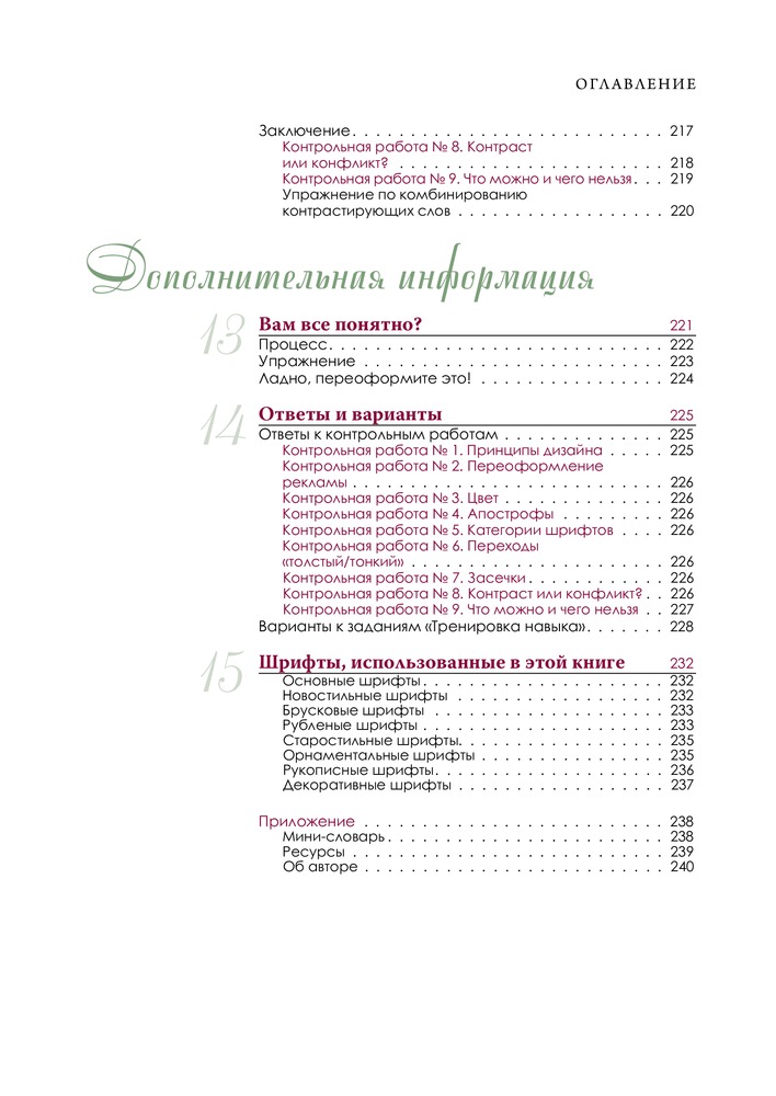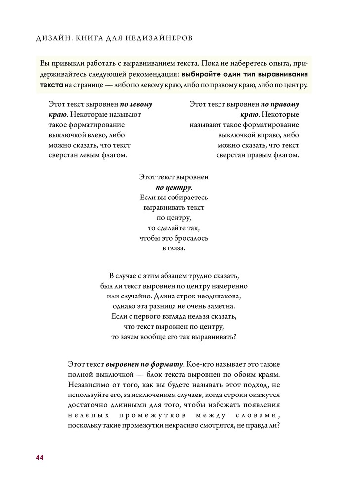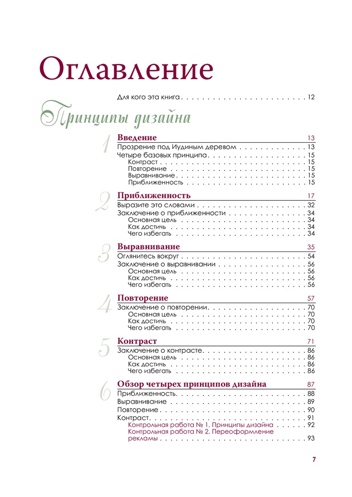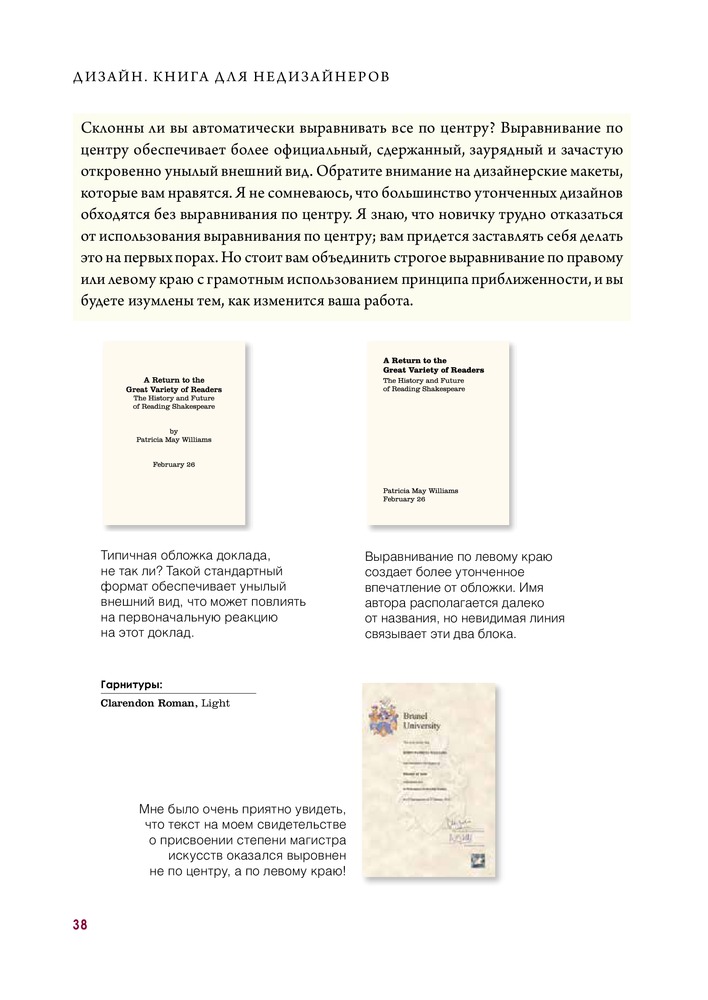 Автор досконально разбирает основные принципы дизайна. Очень много примеров. Автор пытается донести материал до своего читателя, чтобы он уж точно все понял, поэтому каждая глава снабжена заданиями для проверки, что позволяет самому применить знания на практике. Так же есть ключи к заданиям. Очень приятная книга. Качество печати хорошее. Понравилось так же, что везде указаны использованные шрифты. Будет полезно не только дилетантам. Мне как начинающему дизайнеру книга оказалась нужной.