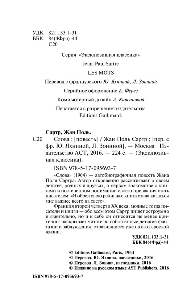 Словатехники письма информативность биография автора волнистая обложка пятно В данный момент этот товар отсутствует в продаже. Возможно, у нас найдется аналогичный или похожий товар здесь. Серия: Эксклюзивная классика «Слова» (1964) — автобиографичная повесть Жана Поля Сартра. Автор откровенно рассказывает о своем детстве, родных и друзьях, о первом знакомстве с книгами и постепенном понимании своего призвания стать писателем: «Я обрел свою религию: книга стала казаться мне важнее всего на свете». |