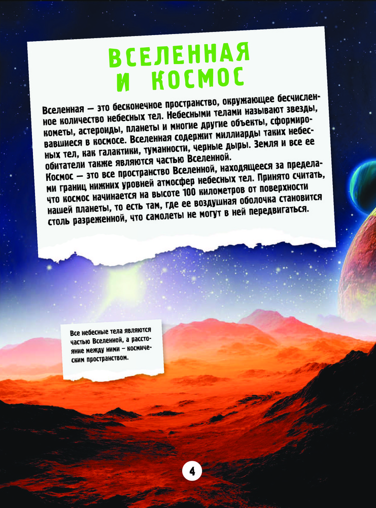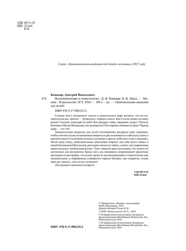 Вселенноведение и планетологияДмитрий Васильевич Кошевар, Вячеслав Владимирович Ликсо В данный момент этот товар отсутствует в продаже. Возможно, у нас найдется аналогичный или похожий товар здесь. Серия: Занимательная академия для детей Занимательная академия для детей гостеприимно раскрыла свои страницы, чтобы ответить на все возникающие вопросы и дать возможность побольше узнать о каждой планете Солнечной системы, спутниках и других небесных телах и явлениях. Читая книгу «Вселенноведение и планетология», любознательные школьники откроют для себя много нового о нашей бесконечной Вселенной, разгадают многие ее тайны, узнают, как современная наука исследует необъятный космос. Текст написан простым языком, что делает его доступным для восприятия. Кроме того, все материалы сопровождают красочные наглядные иллюстрации, что делает уроки по вселенноведению и планетологии более занимательными, а информация усваивается гораздо быстрее. |