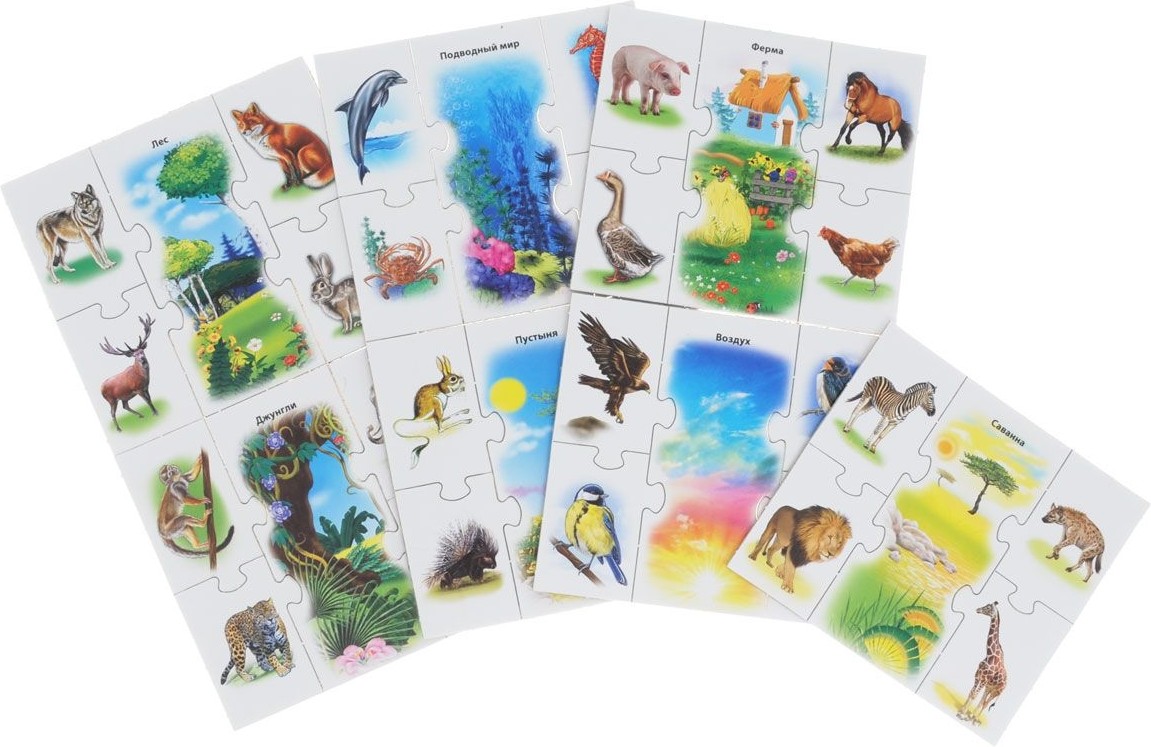 Набор состоит из центральной карточки, к которой присоединяются пазловым замком 4 картинки. Картон плотный и толстый, но в использовании неудобен, очень топорное и дешевое исполнение, в работе быстро разбалтывается. Перечисляю темы: саванна, лес, ферма, джунгли, пустыня. пожалела, что взяла.