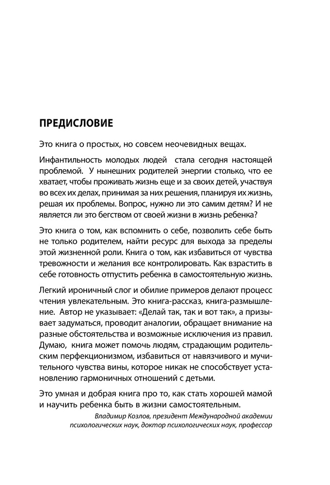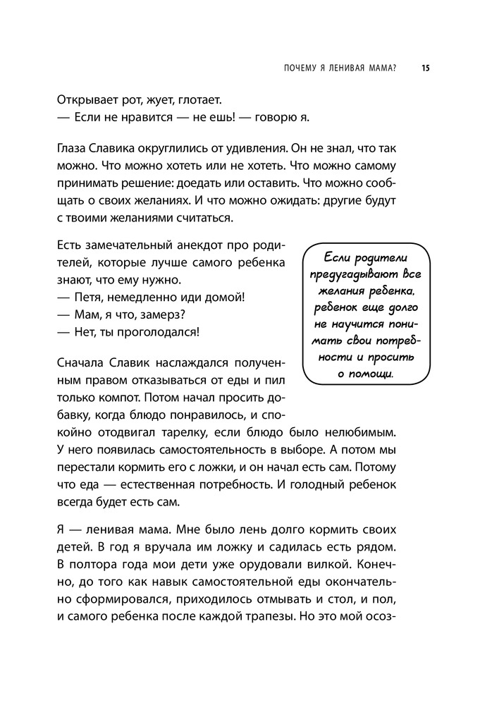 Я довольно скептически отношусь ко всяким поучающим книгам. Как правило, они являются коммерческим проектами и их цель - заработать побольше денег, не особо заботясь о содержании (иногда такую ерунду напишут, а разрекламируют так, будто это панацея от всех проблем). Но!!! Эта книга мне очень понравилась. Дочке 1,5 года и книгу я купила, так сказать, на вырост (ну, типа, она ещё маленькая, и какая в её возрасте самостоятельность). А теперь я понимаю, как хорошо, что я её купила сейчас!! Хотя, сразу могу сказать, что и для мам более взрослых детей, она, однозначно, подойдёт и будет полезна. Большинство мамочек очень похожи: хотят защитить, обезопасить своего ребёнка, дать ему самое лучшее, воспитать его самым умным, и т. д. ........ Зачастую, не обдумав, интересы самого ребёнка (причём, это происходит в большинстве случаев неосознанно). Но, моё мнение, что каждая разумная мама будет стремиться к тому, чтобы максимально подготовить ребёнка ко взрослой жизни. Ребёнок вырастет, и то, насколько он будет приспособлен к жизни, зависит от родителей. В этой книге вы не найдёте конкретных алгоритмов, советов, формул по воспитанию ребёнка, потому что все дети индивидуальны и развиваются по разному. Но очень много реальных примеров из жизни (в некоторых с ужасом узнаешь себя), психологических характеристик, основных тезисов, которые заставляют реально задуматься о своих действиях. В общем, книга интересная, заставила задуматься и переосмыслить некоторые взгляды на воспитание ребёнка, свои действия. К этой книге я вернусь ещё не один раз, это точно. Приобрету остальные книги "Ленивой мамы".