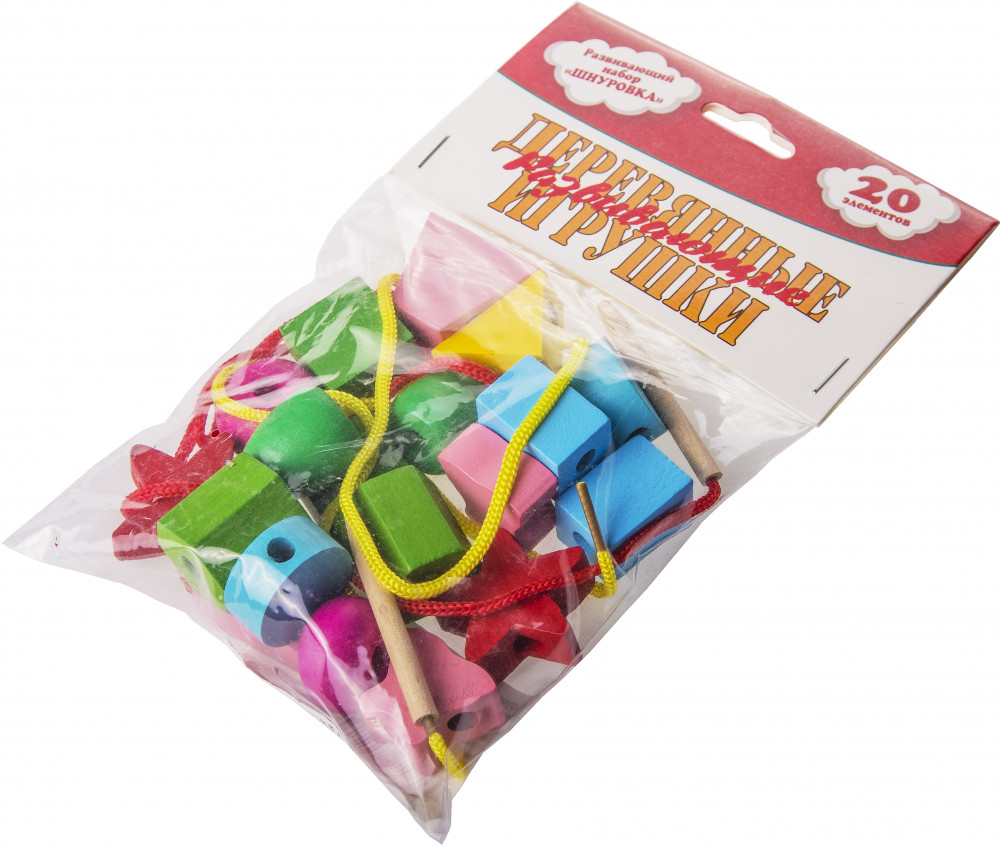Детям интересно нанизывать фигурки. Удобно, что с одной стороны шнурок идет с деревянной палочкой.