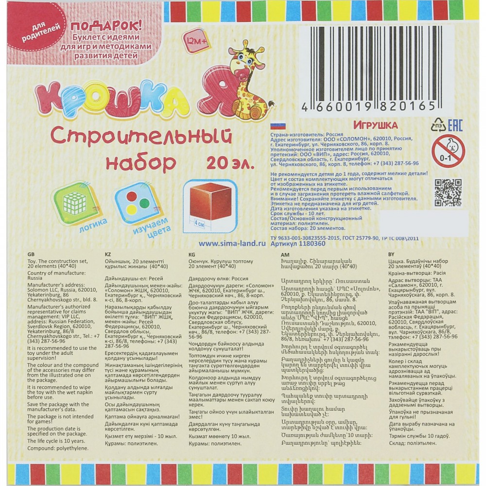 Крошка Я Строительный набор, 20 элементов 4х4 см-25% +82 без запаха яркие детали пластик прочный лёгкие детали неустойчивые кубики маленький размер
