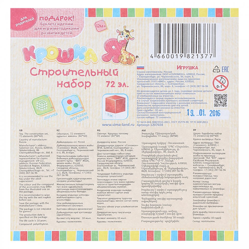 Крошка Я Строительный набор, 72 элемента 6х6 см-40% +386 без запаха цветной пластик плотная пластмасса легкие приятные цвета