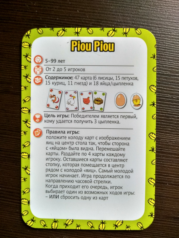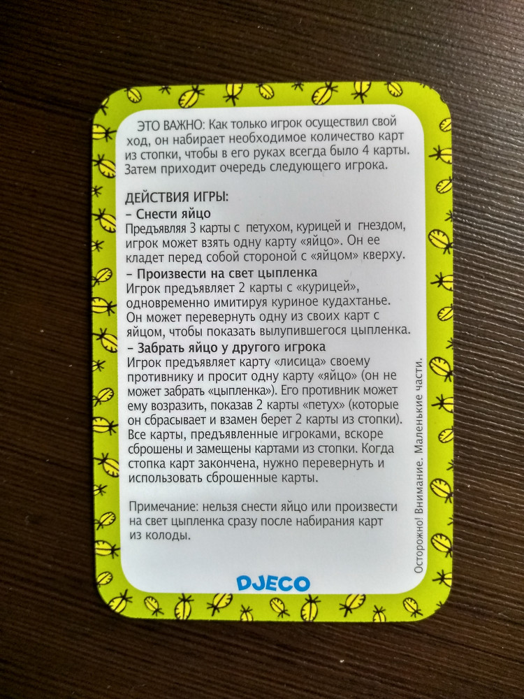 💳 Оплатить за товар можно при получении 🇰🇿 Есть бесплатная доставка по Казахстану от 1 дня 🎁 Копите бонусы с каждой покупки Игрокам раздаётся по 4 карты из колоды, карты яйца-цыплёнка не раздаются и в колоде не используются. Сбрасывая и передавая карты соперникам необходимо собирать комбинации карт («курица», «петух», «гнездо» и др) позволяющие получать карту «яйцо» и далее вывести цыплёнка (перевернуть карту «яйцо»). Карты «лисица» позволяют забирать карты «яйцо» у соперников, карты «петух» (2 штуки) позволяют защититься от карты «лисица». Для победы необходимо вывести три цыплёнка. |