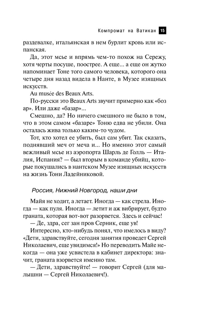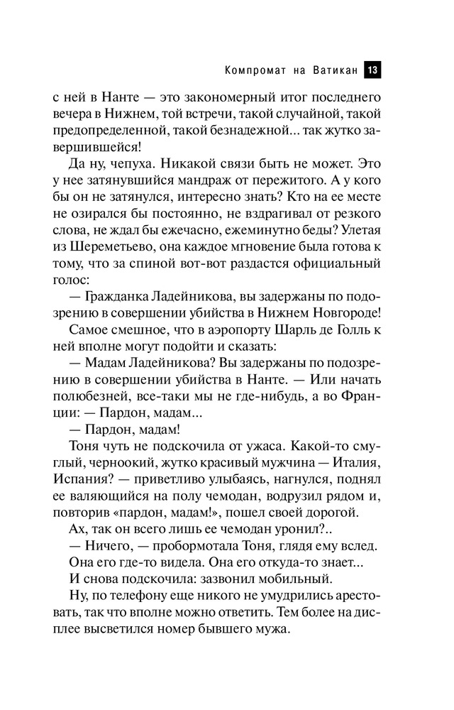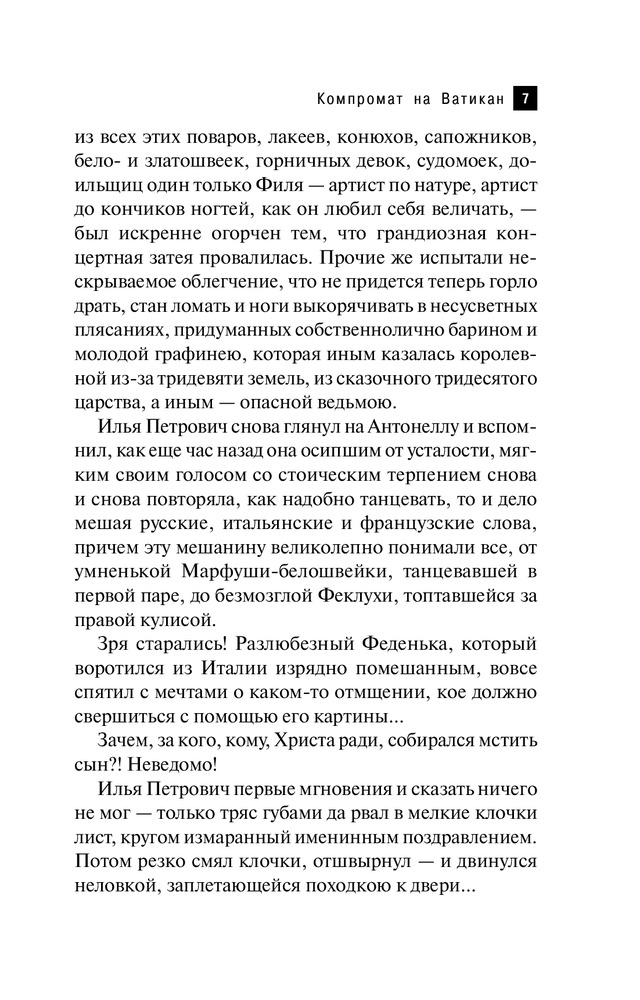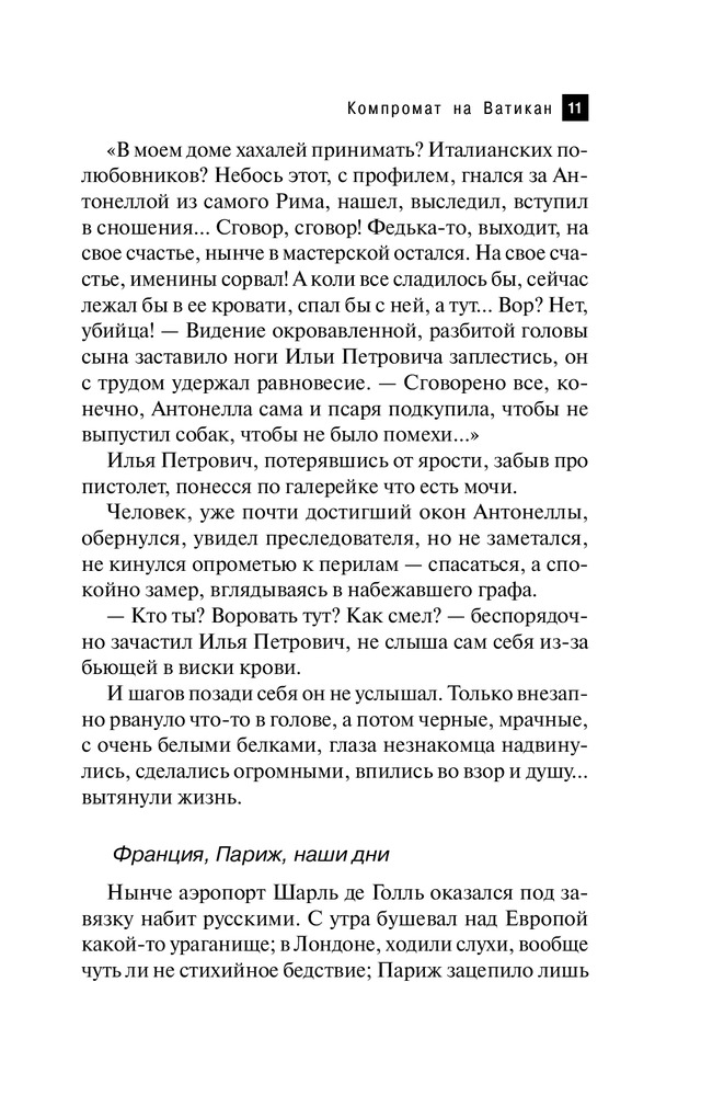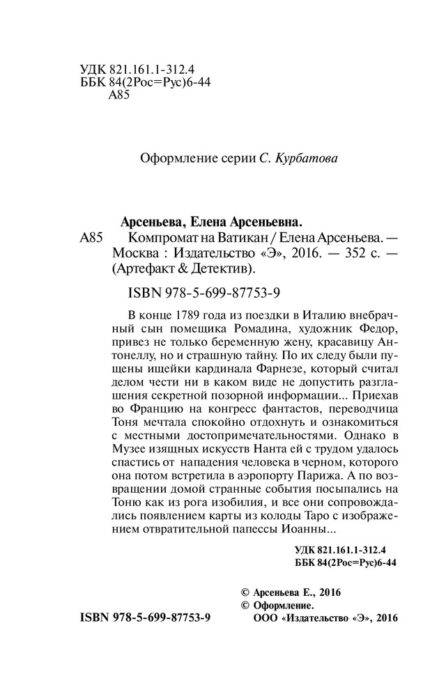 Компромат на ВатиканВ данный момент этот товар отсутствует в продаже. Возможно, у нас найдется аналогичный или похожий товар здесь. Серия: Артефакт-детектив В конце 1789 года из поездки в Италию внебрачный сын помещика Ромадина, художник Федор, привез не только беременную жену, красавицу Антонеллу, но и страшную тайну. По их следу были пущены ищейки кардинала Фарнезе, который считал делом чести ни в каком виде не допустить разглашения секретной позорной информации... Приехав во Францию на конгресс фантастов, переводчица Тоня мечтала спокойно отдохнуть и ознакомиться с местными достопримечательностями. Однако в музее Изящных искусств Нанта, ей с трудом удалось спастись от нападения человека в черном, которого она потом встретила в аэропорту Парижа. А по возвращении домой странные события посыпались на Тоню как из рога изобилия, и все они сопровождались появлением карты из колоды таро с изображением отвратительной Папессы Иоанны... |