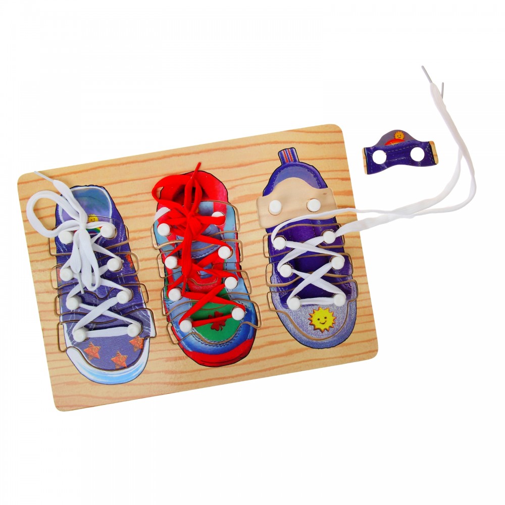 Если кроха уже освоил разные виды шнуровок и собирается быстрее всех, можете предложить ему поиграть с друзьями и проверить, кто ловчее справится с заданием! С рамкой-вкладышем «3 ботинка» каждодневная обязанность превратится в увлекательную забаву! Изделие выполнено из безопасных материалов: текстиля и дерева. Подходит для деток в возрасте от 1 года.