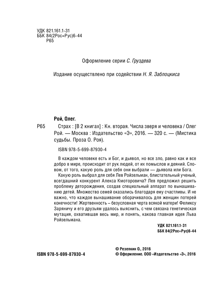 Страх. Книга вторая. Числа зверя и человекаВ данный момент этот товар отсутствует в продаже. Возможно, у нас найдется аналогичный или похожий товар здесь. Серия: Мистика судьбы. Проза О.Роя (обложка) В каждом человеке есть и Бог, и дьявол, но все зло, равно как и все добро в мире, происходит от рук людей, от их помыслов и деяний. Словом, от того, какую роль для себя они выбрали — дьявола или Бога. |